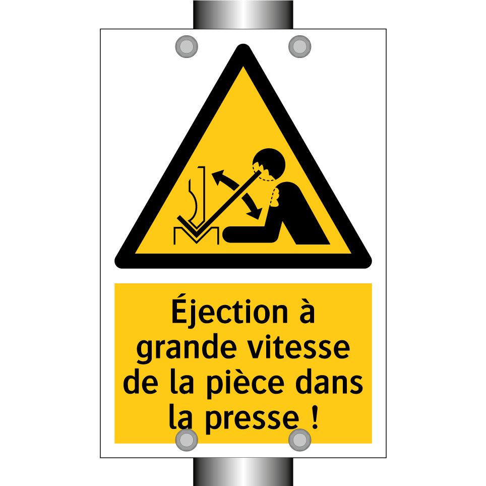 Panneau d'avertissement avec le texte : "Éjection à grande vitesse de la pièce dans la presse !"
