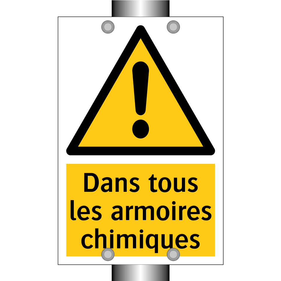 Panneau d'avertissement avec le texte : "Dans tous les armoires chimiques"