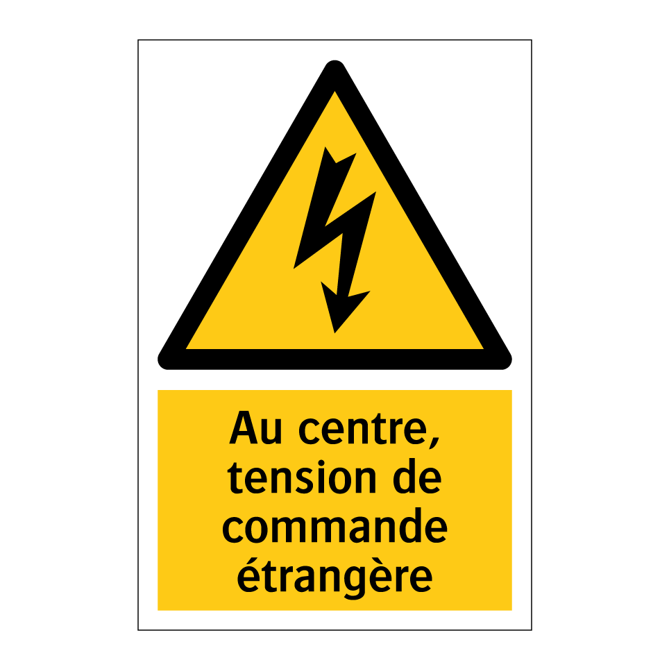 Panneau d'avertissement avec le texte : "Au centre, tension de commande étrangère"