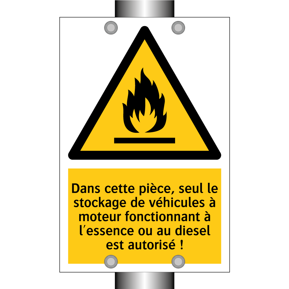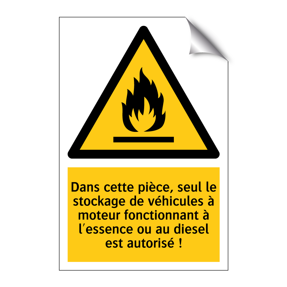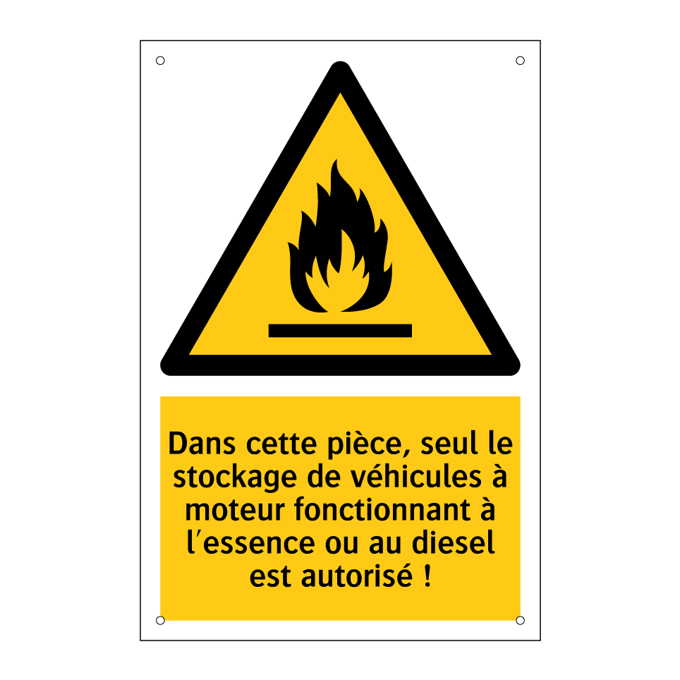 Panneau d'avertissement avec le texte : "Dans cette pièce, seul le stockage de véhicules à moteur fonctionnant à l'essence ou au diesel est autorisé !"