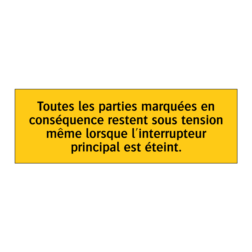 Panneau d'avertissement avec le texte : "Toutes les parties marquées en conséquence restent sous tension même lorsque l'interrupteur principal est éteint"