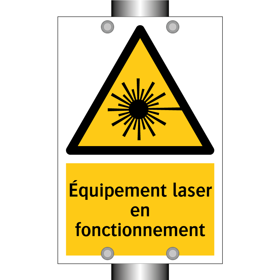 Panneau d'avertissement avec le texte : "Équipement laser en fonctionnement"