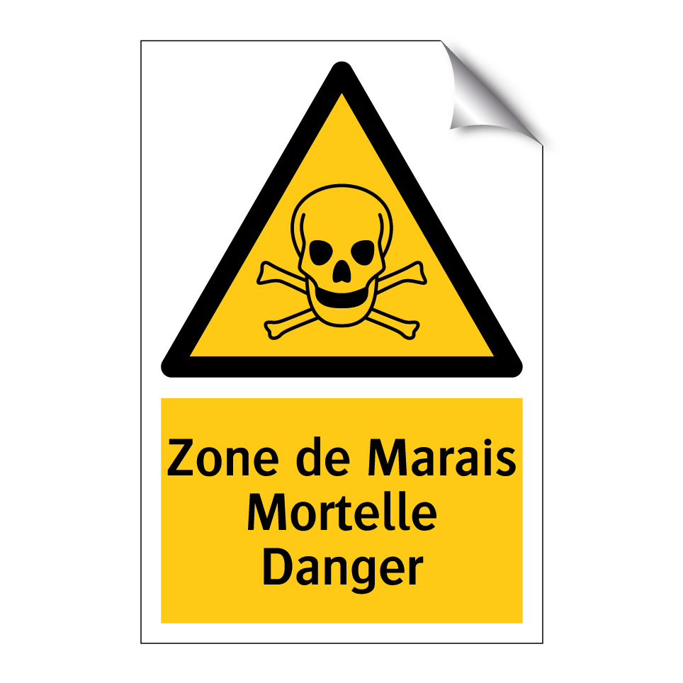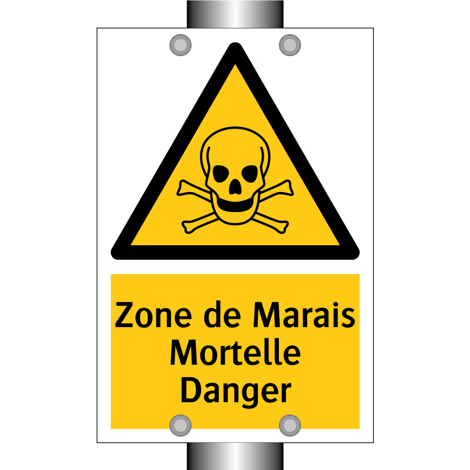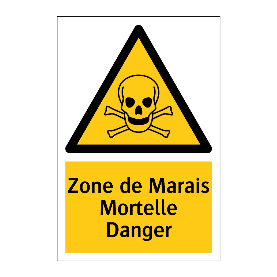 Panneau d'avertissement avec le texte : "Zone de Marais Mortelle Danger"
