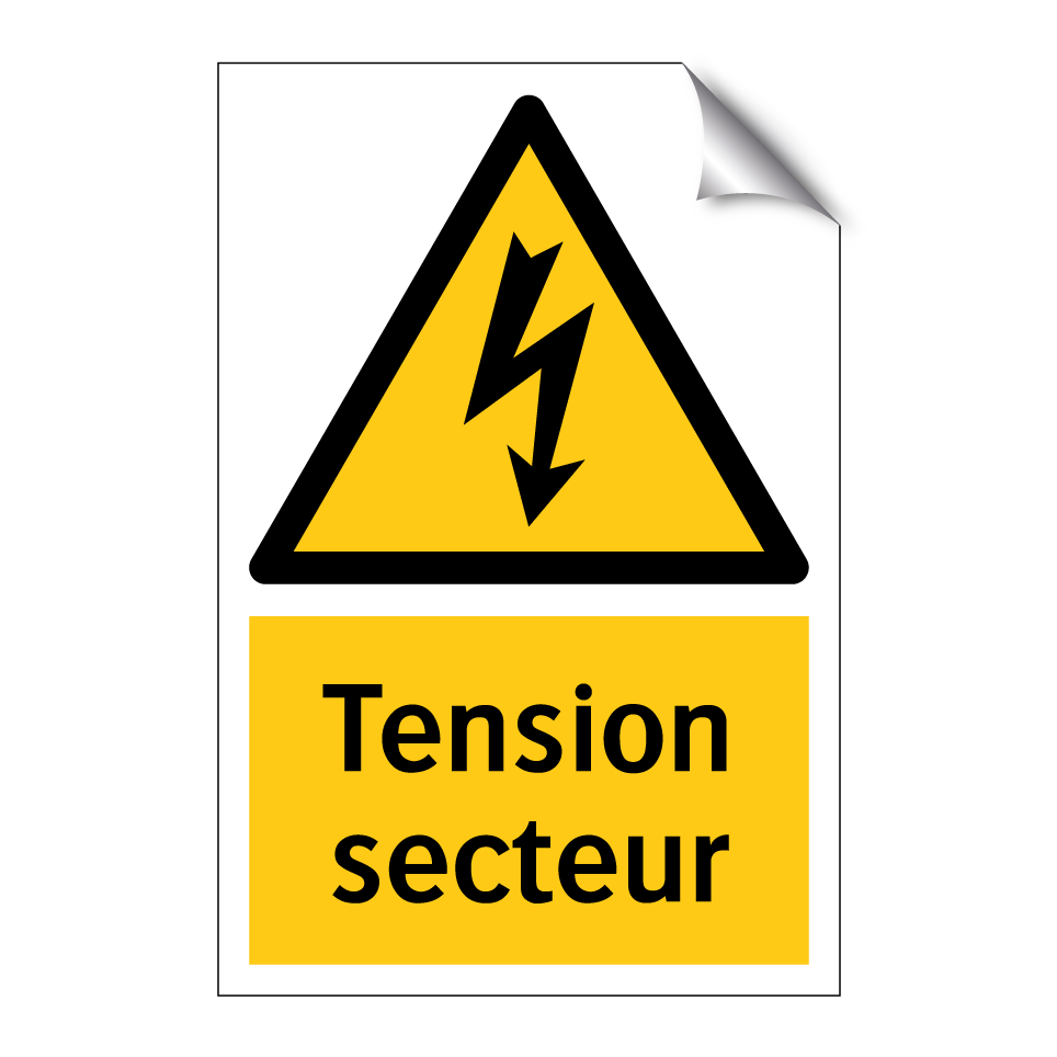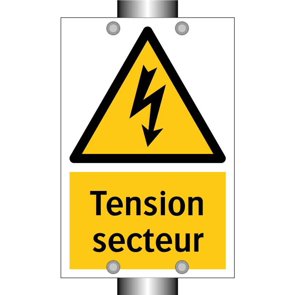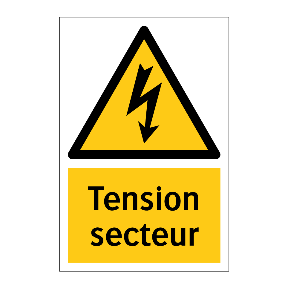 Panneau d'avertissement avec le texte : "Tension secteur"