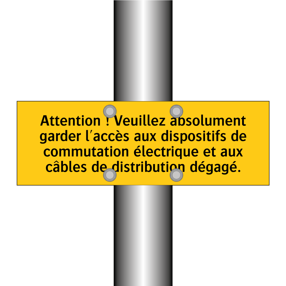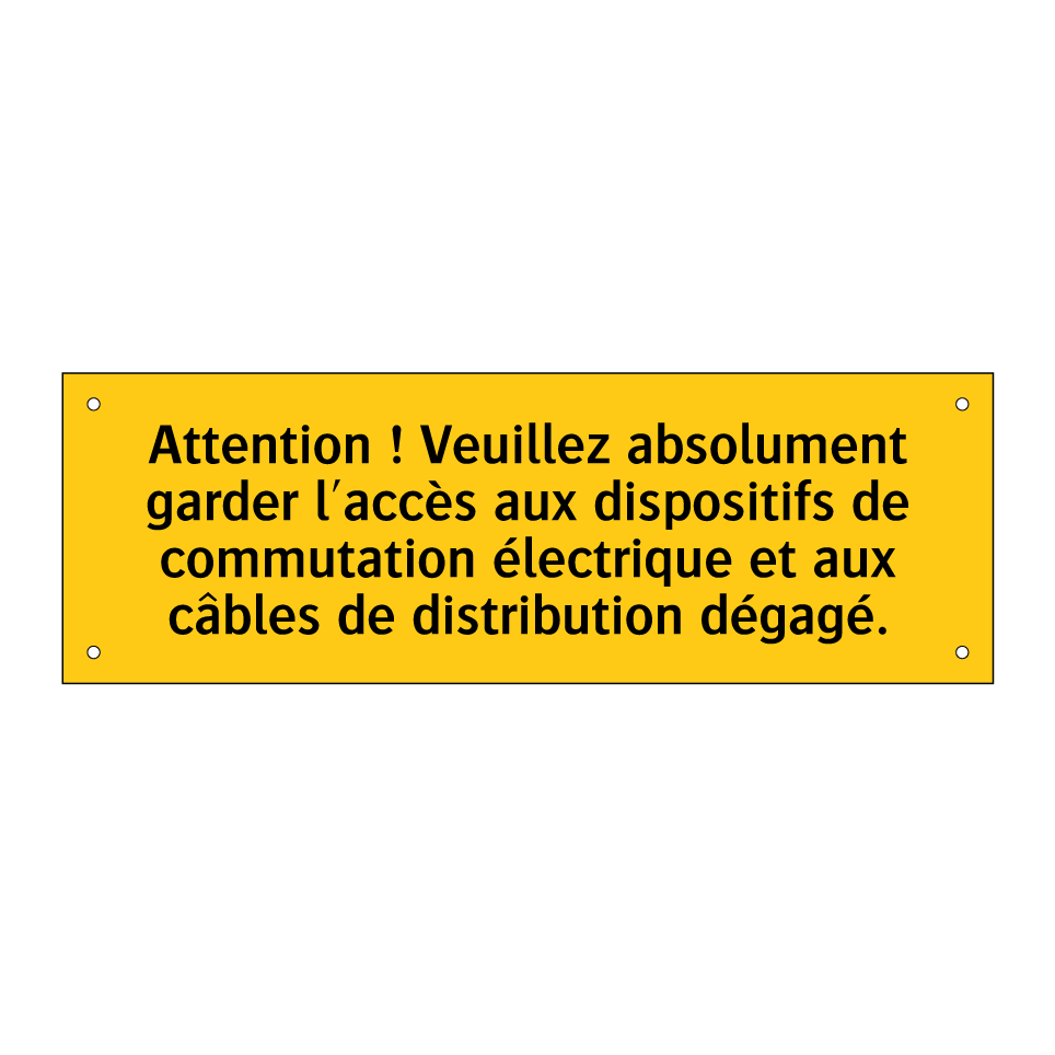 Panneau d'avertissement avec le texte : "Attention ! Veuillez absolument garder l'accès aux dispositifs de commutation électrique et aux câbles de distribution dégagé"