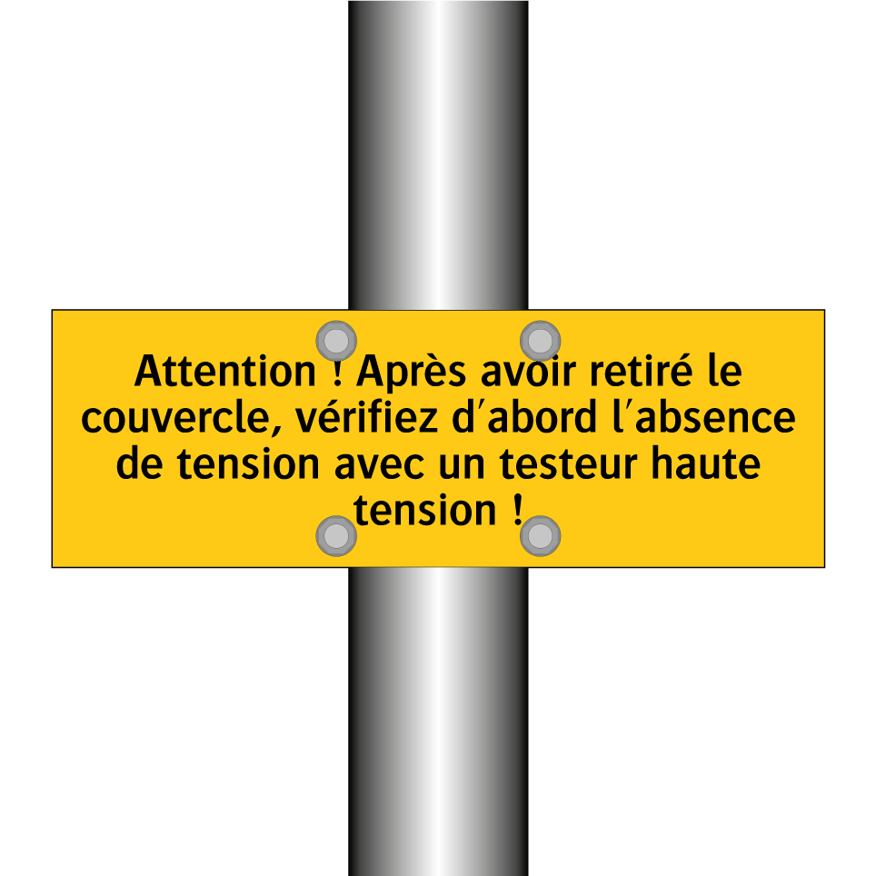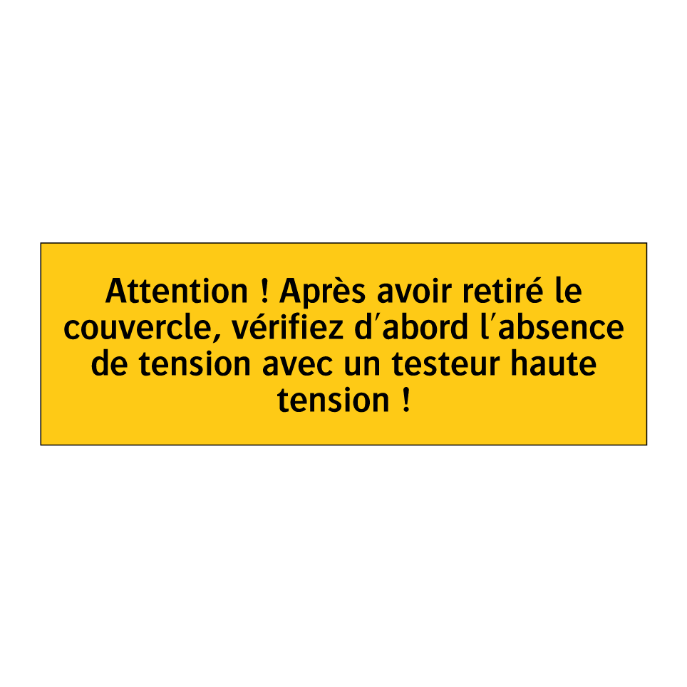 Panneau d'avertissement avec le texte : "Attention ! Après avoir retiré le couvercle, vérifiez d'abord l'absence de tension avec un testeur haute tension !"