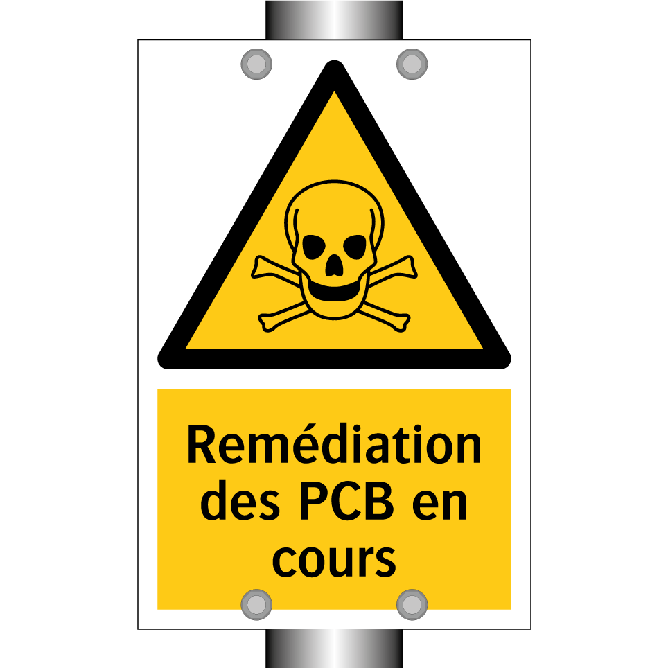 Panneau d'avertissement avec le texte : "Remédiation des PCB en cours"