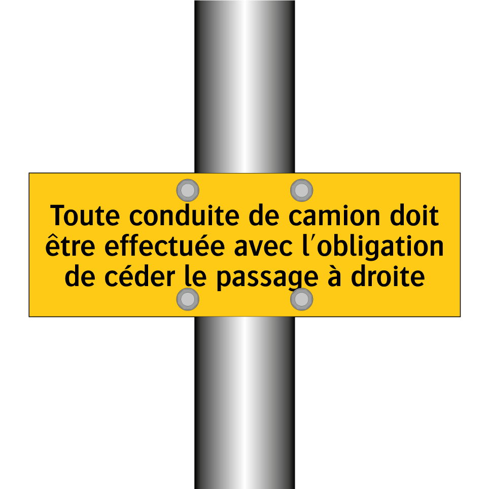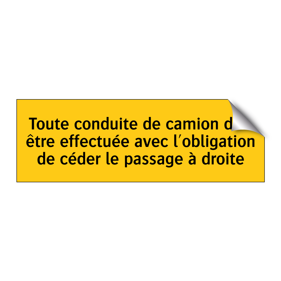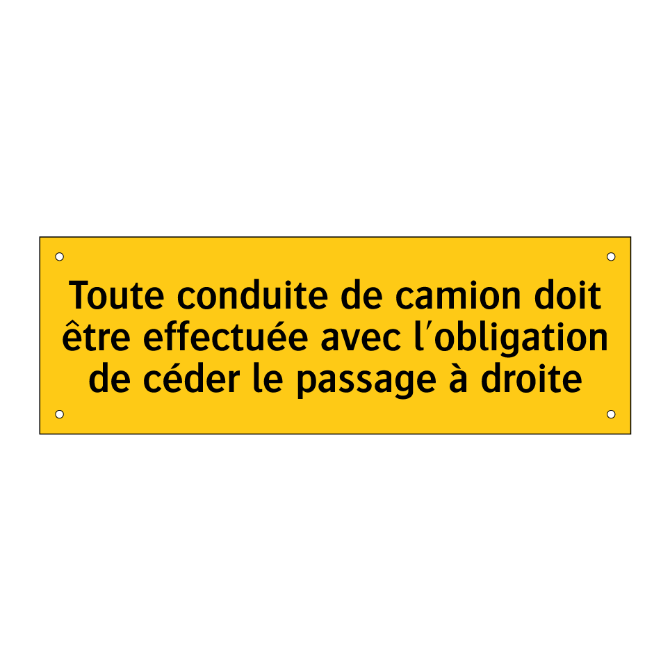 Panneau d'avertissement avec le texte : "Toute conduite de camion doit être effectuée avec l'obligation de céder le passage à droite"