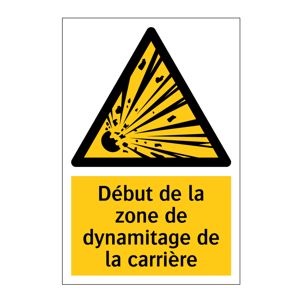 Ce panneau d'avertissement est essentiel pour garantir la sécurité dans les zones de carrière. Grâce à sa couleur jaune vive et son texte noir, il attire immédiatement l'attention, signalant le début d'une zone de dynamitage. Ce panneau est idéal pour être placé à l'entrée des sites de construction ou des carrières, où des explosions contrôlées peuvent avoir lieu. En installant ce panneau, vous informez efficacement les travailleurs et les visiteurs des dangers potentiels, assurant ainsi une prise de conscience accrue des risques. Utilisez ce panneau pour prévenir les accidents et maintenir un environnement de travail sécurisé.