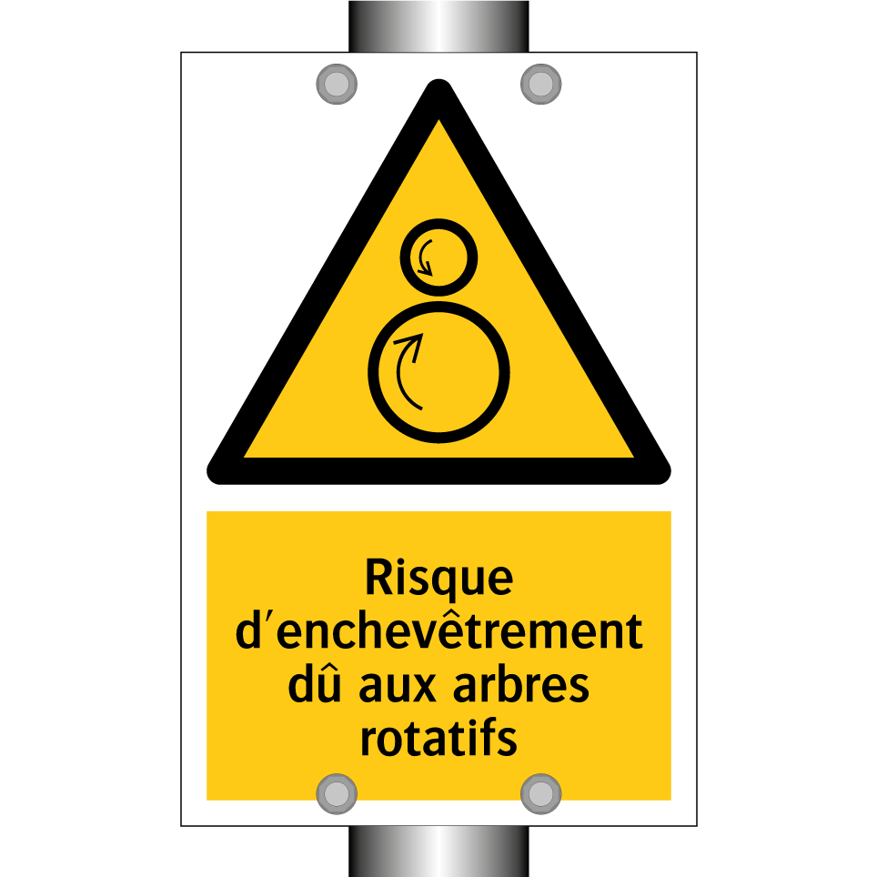 Panneau d'avertissement avec le texte : "Risque d'enchevêtrement dû aux arbres rotatifs"
