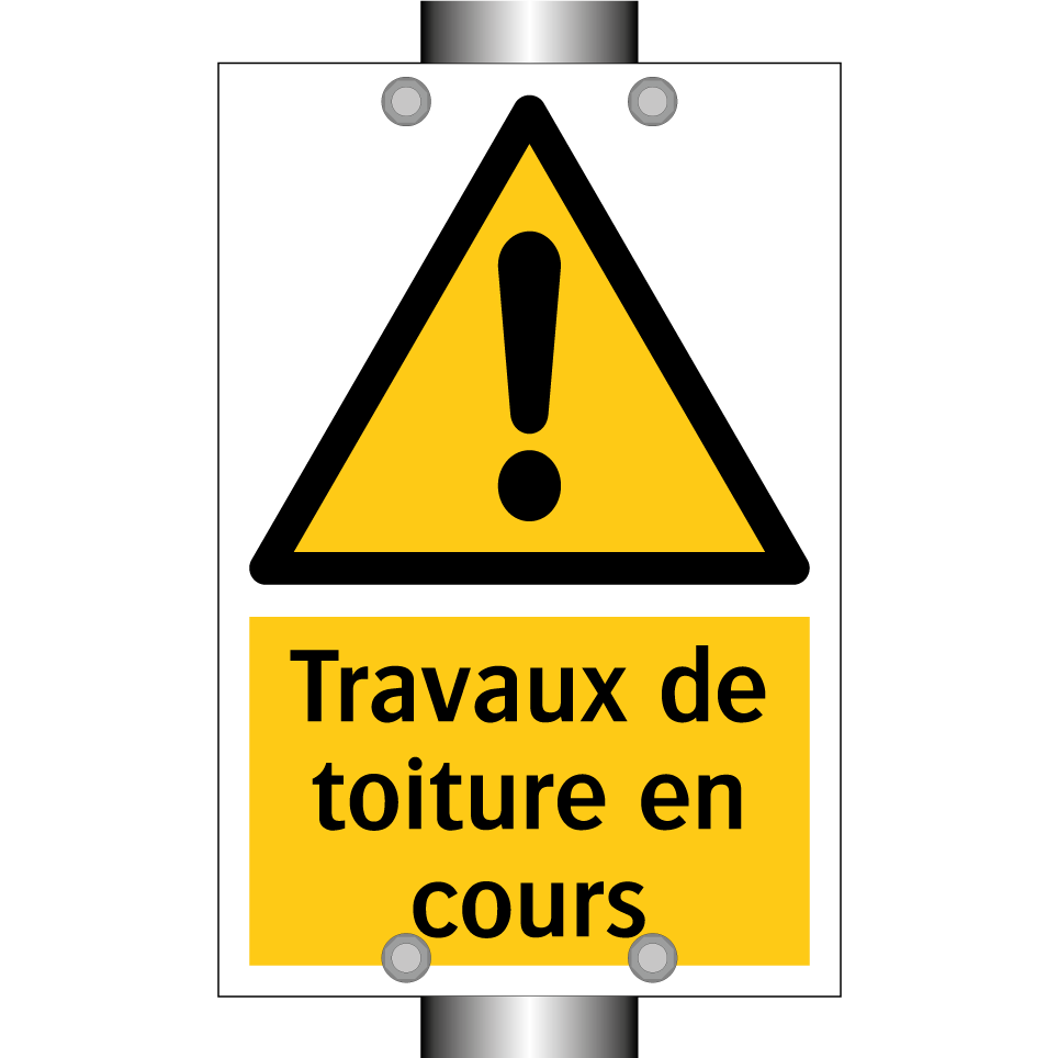 Panneau d'avertissement avec le texte : "Travaux de toiture en cours"