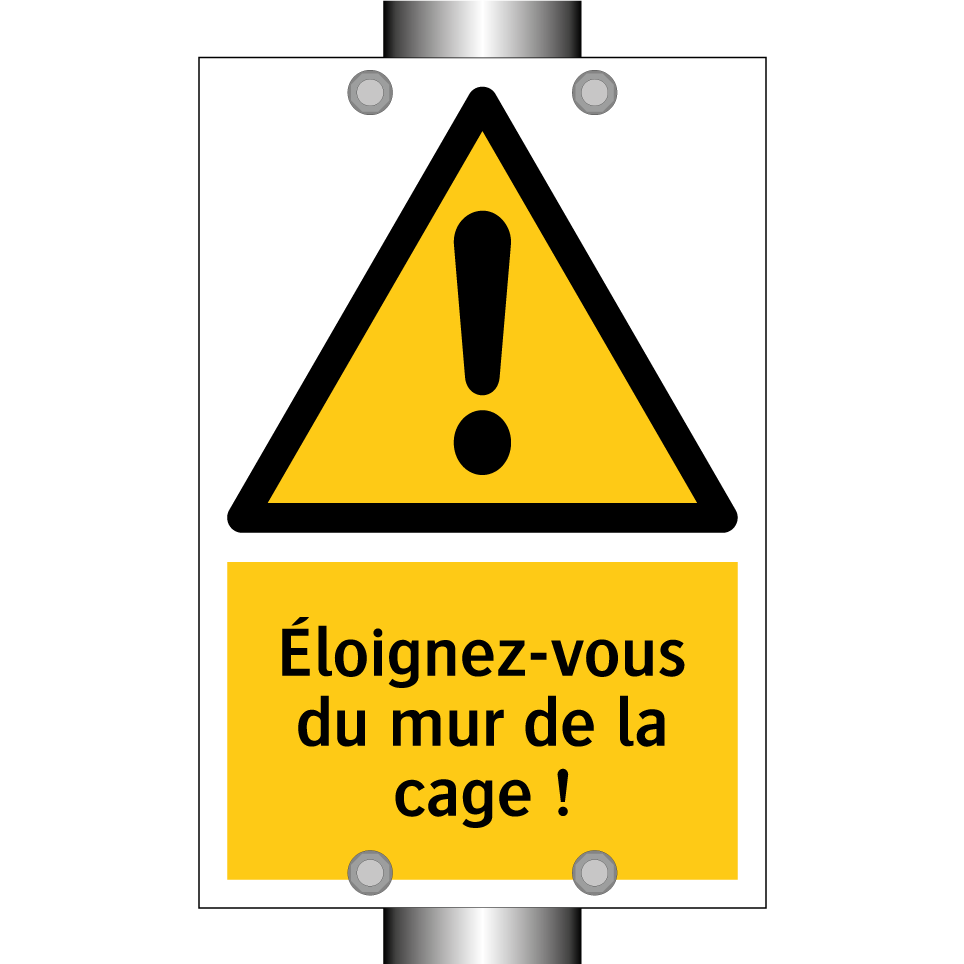 Panneau d'avertissement avec le texte : "Éloignez-vous du mur de la cage !"