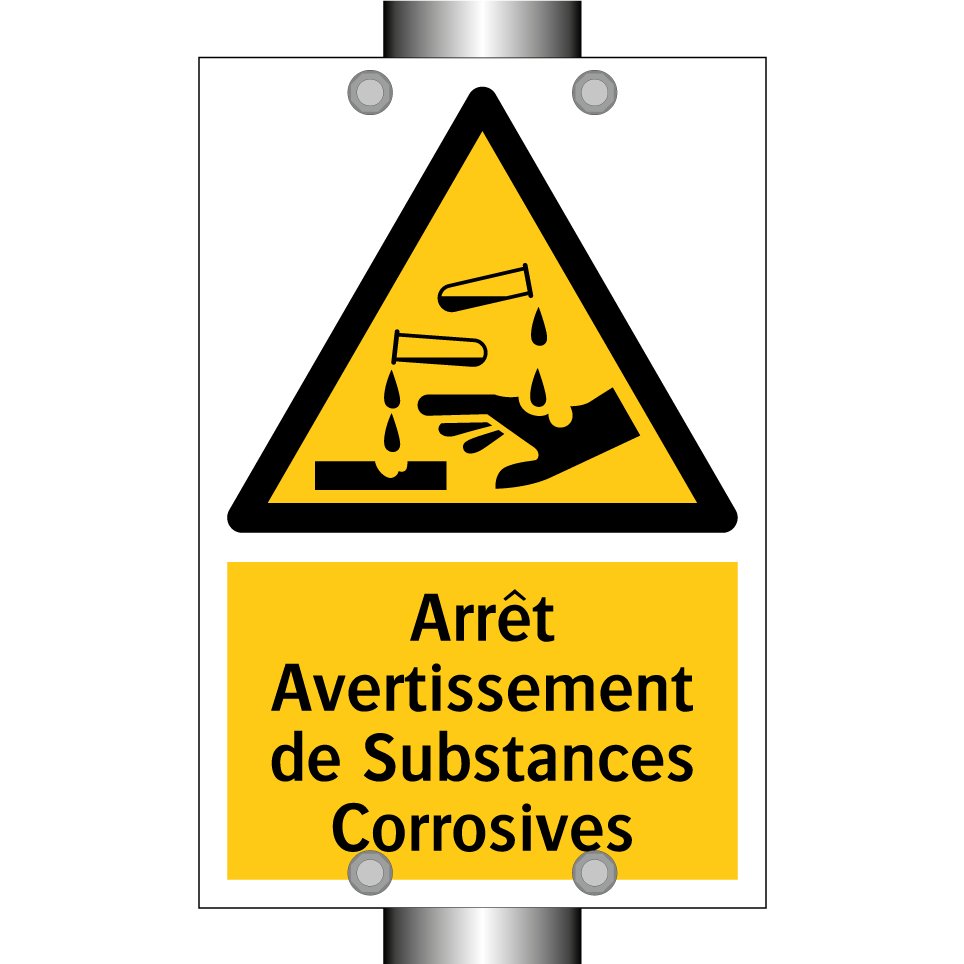 Panneau d'avertissement avec le texte : "Arrêt Avertissement de Substances Corrosives"
