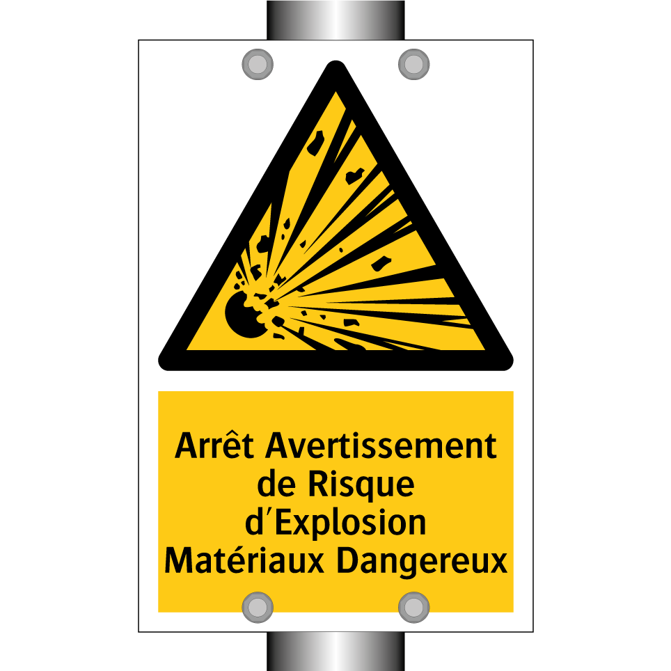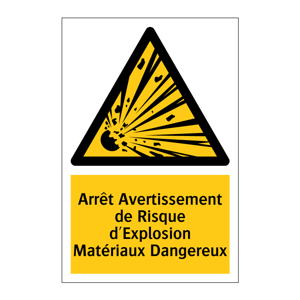 Panneau d'avertissement avec le texte : "Arrêt Avertissement de Risque d'Explosion Matériaux Dangereux"