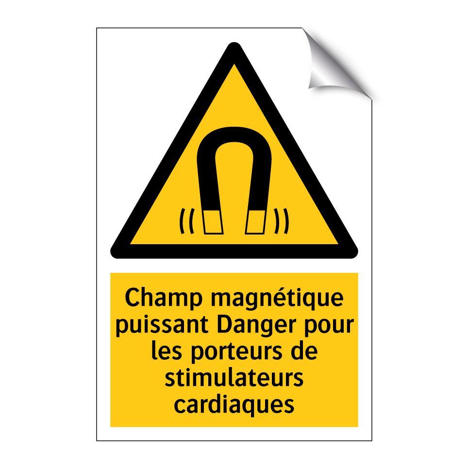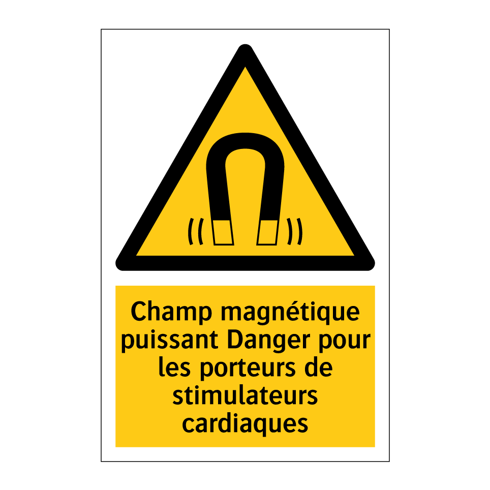 Panneau d'avertissement avec le texte : "Champ magnétique puissant Danger pour les porteurs de stimulateurs cardiaques"