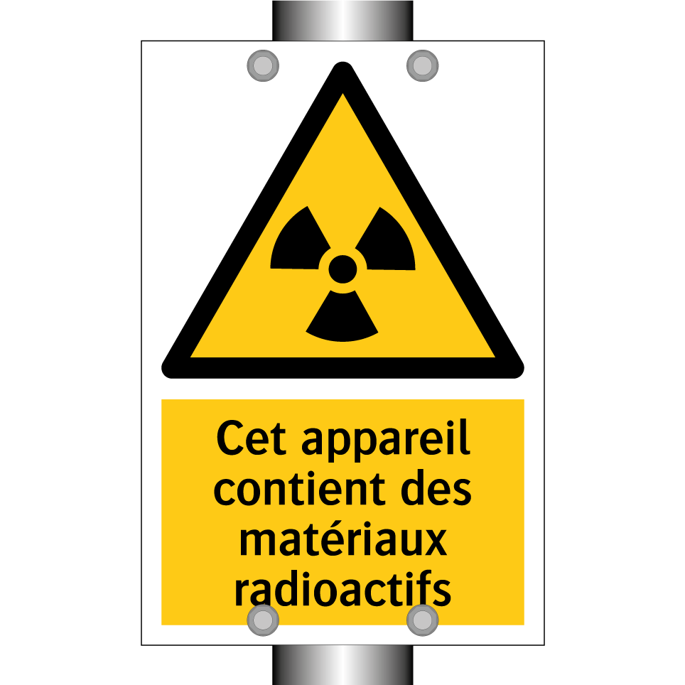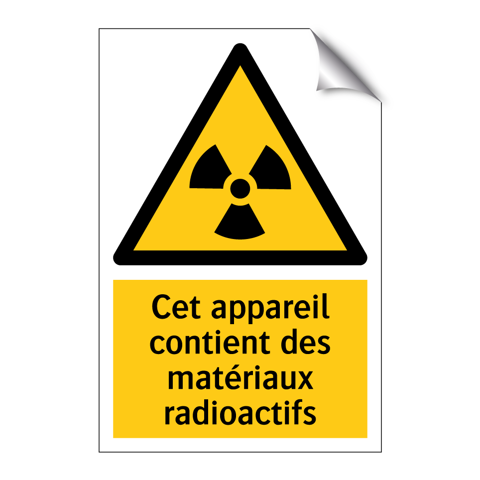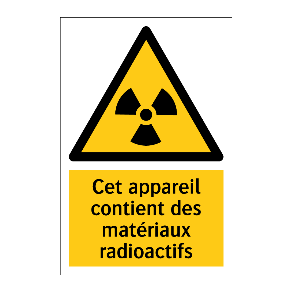Panneau d'avertissement avec le texte : "Cet appareil contient des matériaux radioactifs"