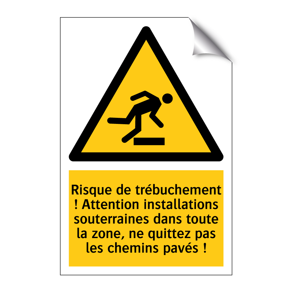 Ce panneau d'avertissement est essentiel pour garantir la sécurité dans les zones où des installations souterraines sont présentes. Idéal pour les chantiers de construction, les parcs ou les zones industrielles, il informe les passants des risques potentiels de trébuchement. Grâce à sa couleur jaune vive et son texte noir contrastant, il capte immédiatement l'attention, incitant à la prudence. Placez-le à l'entrée des zones concernées ou le long des chemins pavés pour maximiser la visibilité et prévenir les accidents. Ce panneau est un outil indispensable pour toute entreprise soucieuse de la sécurité de ses employés et visiteurs.