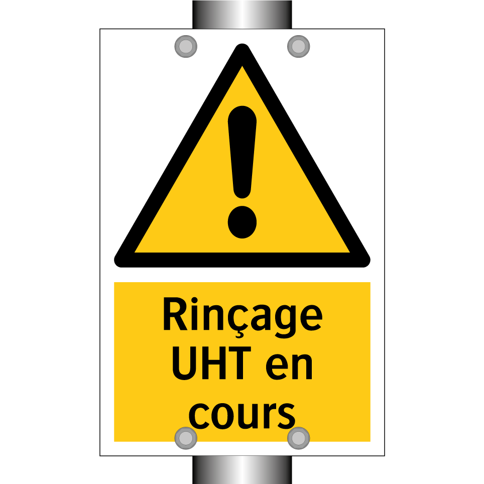 Panneau d'avertissement avec le texte : "Rinçage UHT en cours"