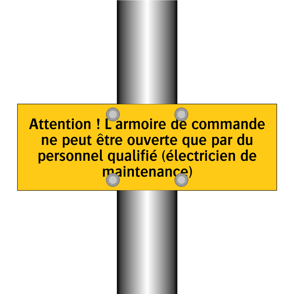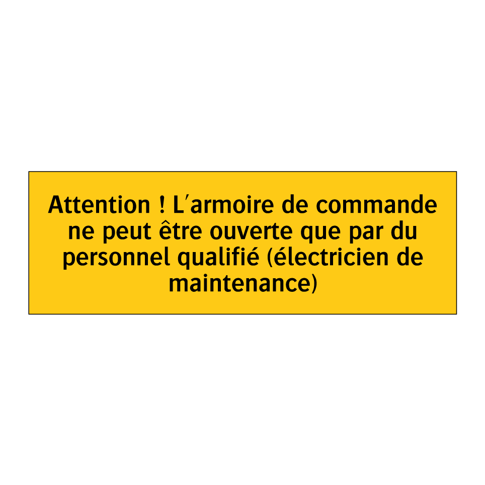 Panneau d'avertissement avec le texte : "Attention ! L'armoire de commande ne peut être ouverte que par du personnel qualifié (électricien de maintenance)"