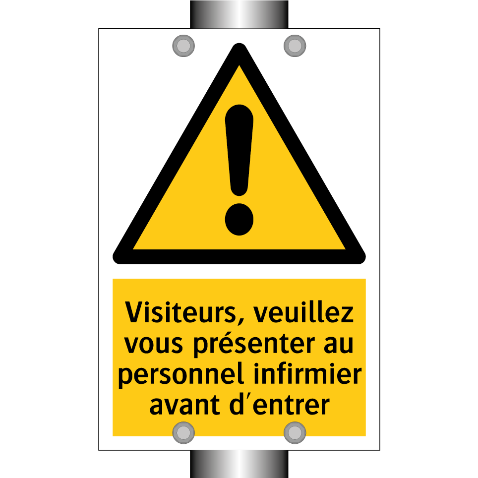 Panneau d'avertissement avec le texte : "Visiteurs, veuillez vous présenter au personnel infirmier avant d'entrer"