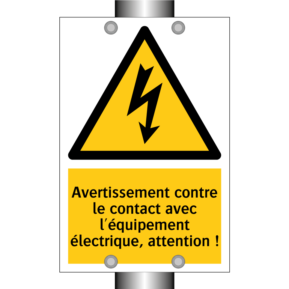 Panneau d'avertissement avec le texte : "Avertissement contre le contact avec l'équipement électrique, attention !"