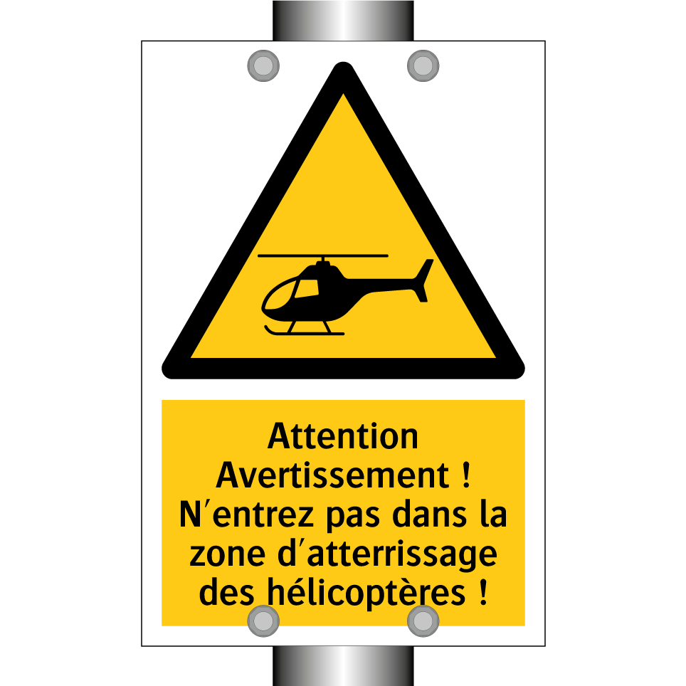 Panneau d'avertissement avec le texte : "Attention Avertissement ! N'entrez pas dans la zone d'atterrissage des hélicoptères !"