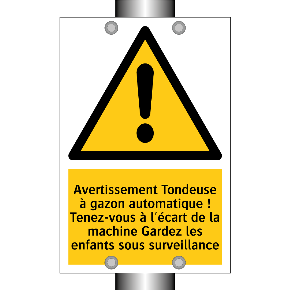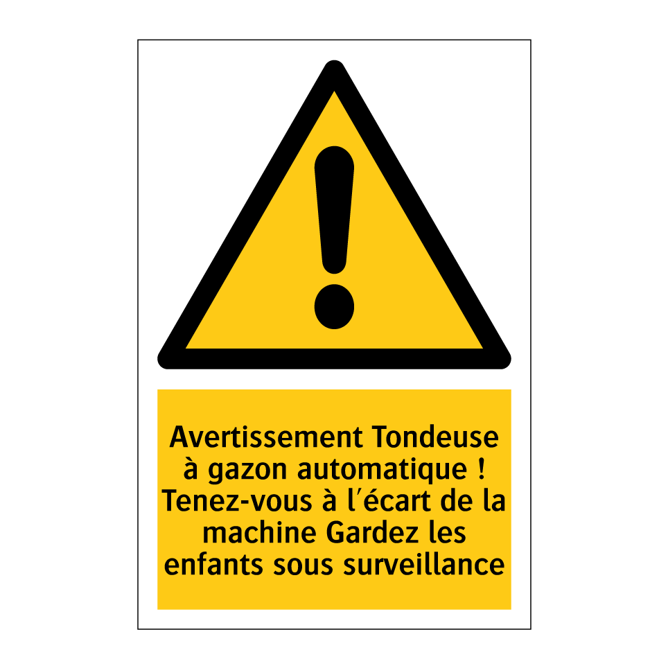 Panneau d'avertissement avec le texte : "Avertissement Tondeuse à gazon automatique ! Tenez-vous à l'écart de la machine Gardez les enfants sous surveillance"