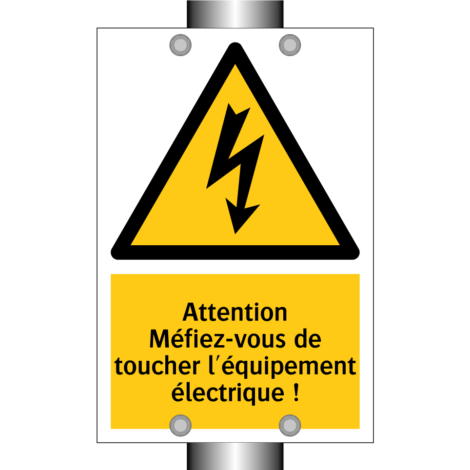 Panneau d'avertissement avec le texte : "Attention Méfiez-vous de toucher l'équipement électrique !"