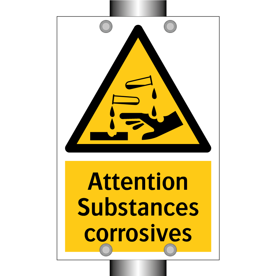Panneau d'avertissement avec le texte : "Attention Substances corrosives"