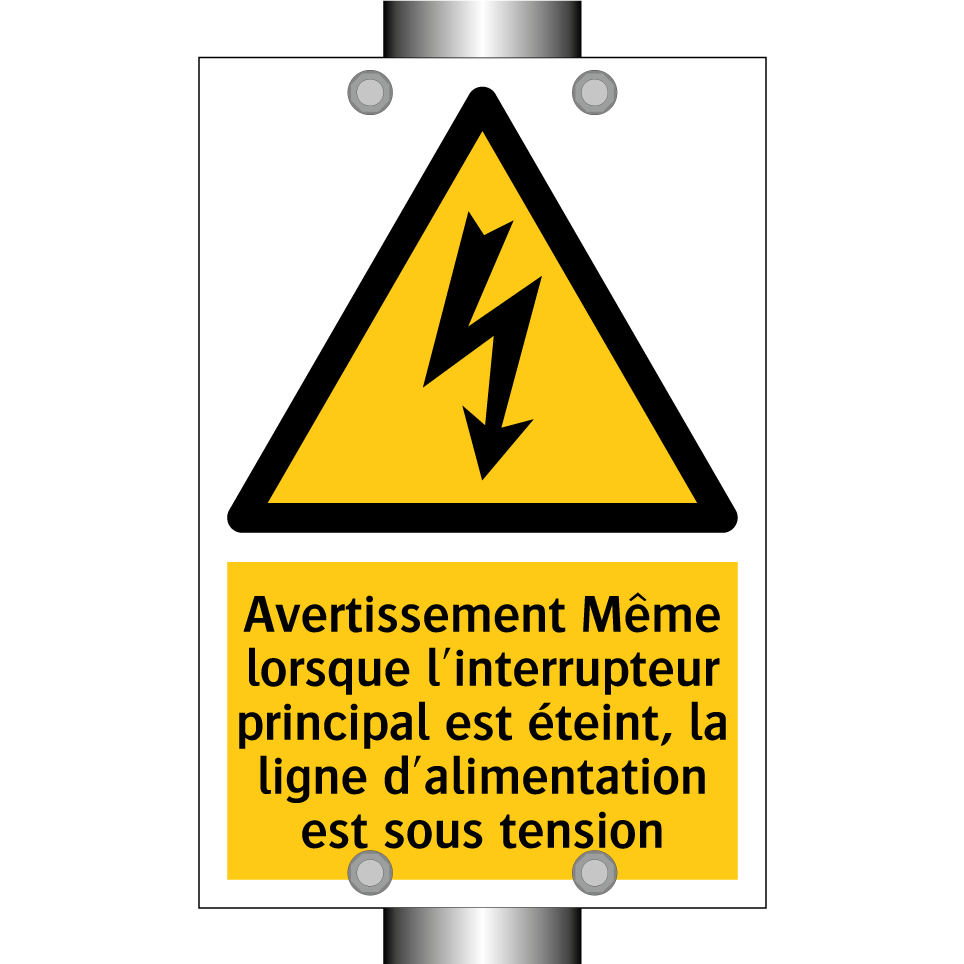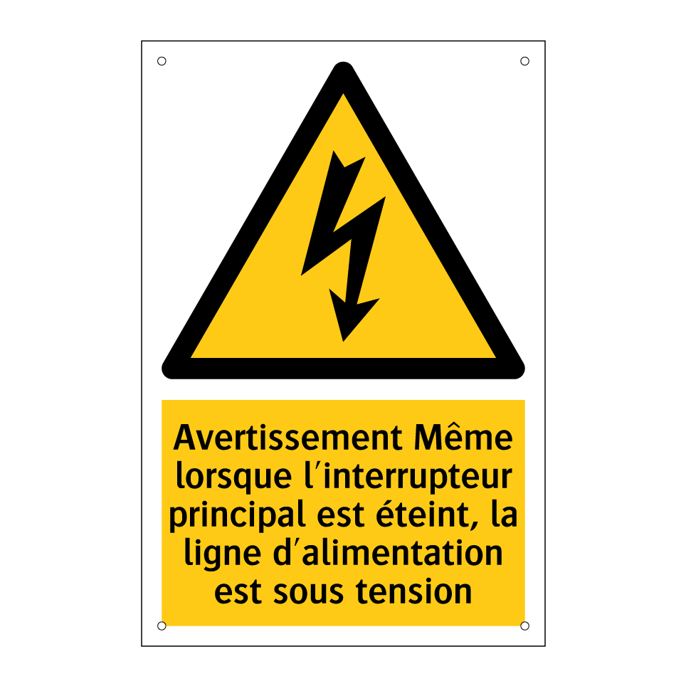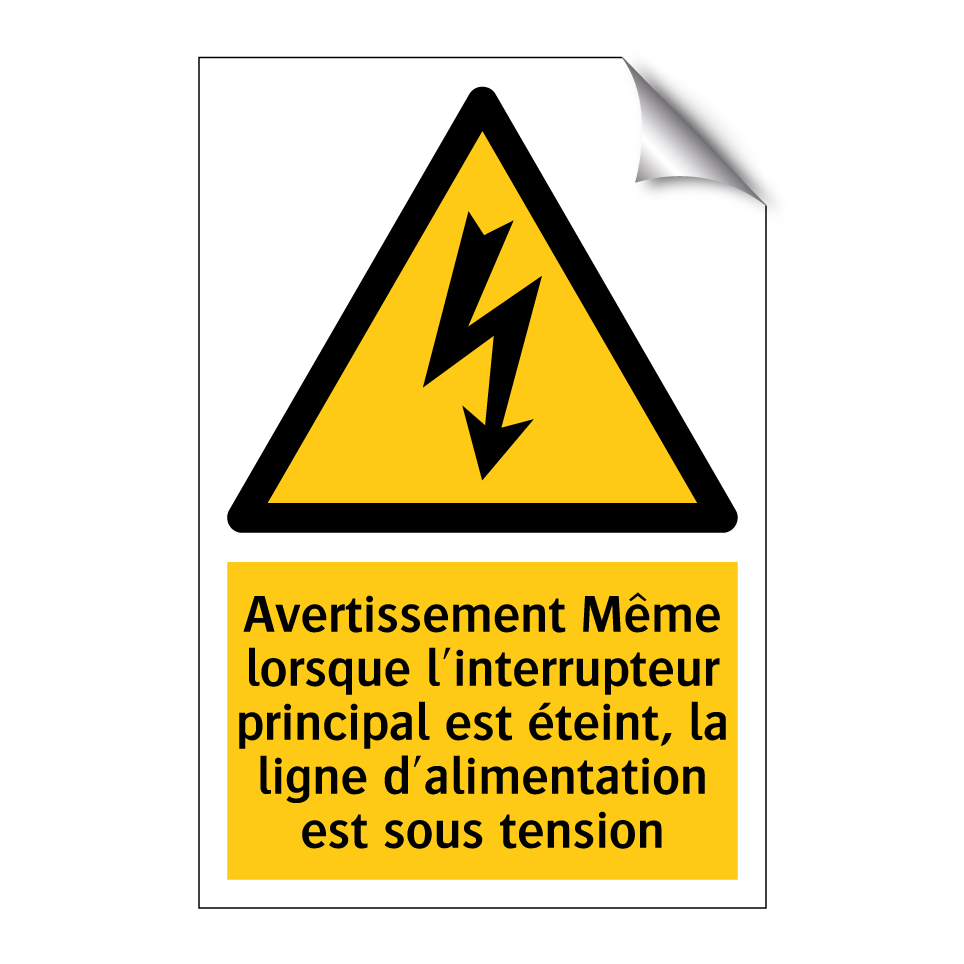 Panneau d'avertissement avec le texte : "Avertissement Même lorsque l'interrupteur principal est éteint, la ligne d'alimentation est sous tension"