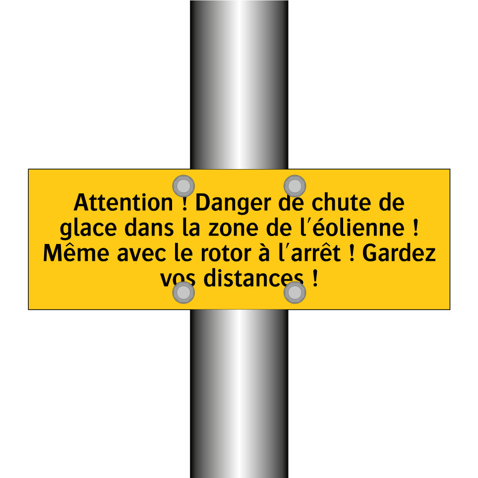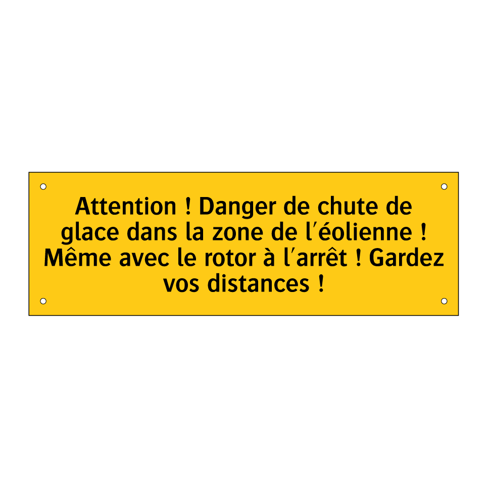 Ce panneau d'avertissement est essentiel pour garantir la sécurité autour des éoliennes. Il est conçu pour alerter les passants du risque potentiel de chute de glace, même lorsque le rotor est immobile. Ce panneau est idéal pour être placé à proximité des éoliennes, dans les parcs éoliens ou sur les sites industriels où des éoliennes sont présentes. En installant ce panneau, vous assurez une communication claire des dangers potentiels, incitant les individus à maintenir une distance de sécurité. Sa couleur jaune vive et son texte noir assurent une visibilité optimale, attirant immédiatement l'attention des personnes dans la zone.