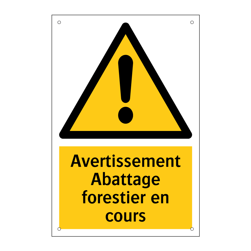 Panneau d'avertissement avec le texte : "Avertissement Abattage forestier en cours"