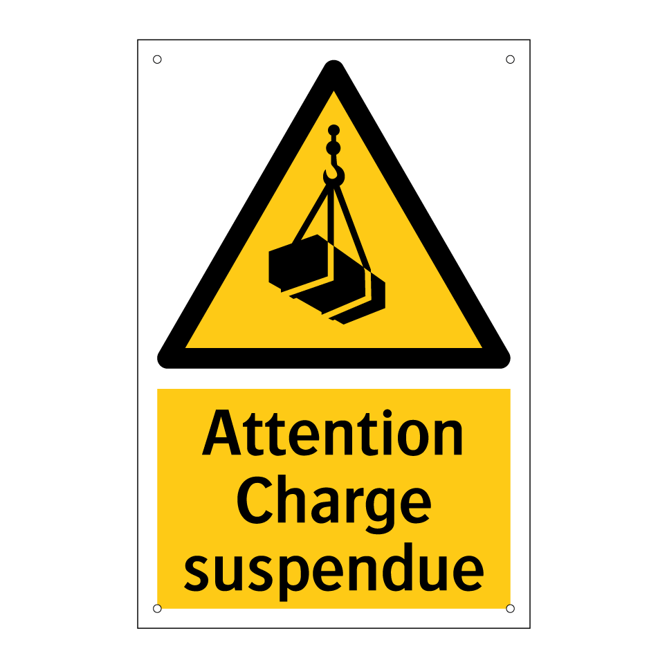 Panneau d'avertissement avec le texte : "Attention Charge suspendue"