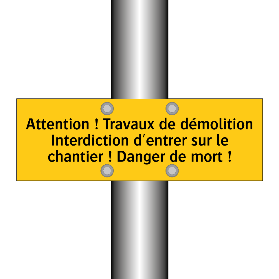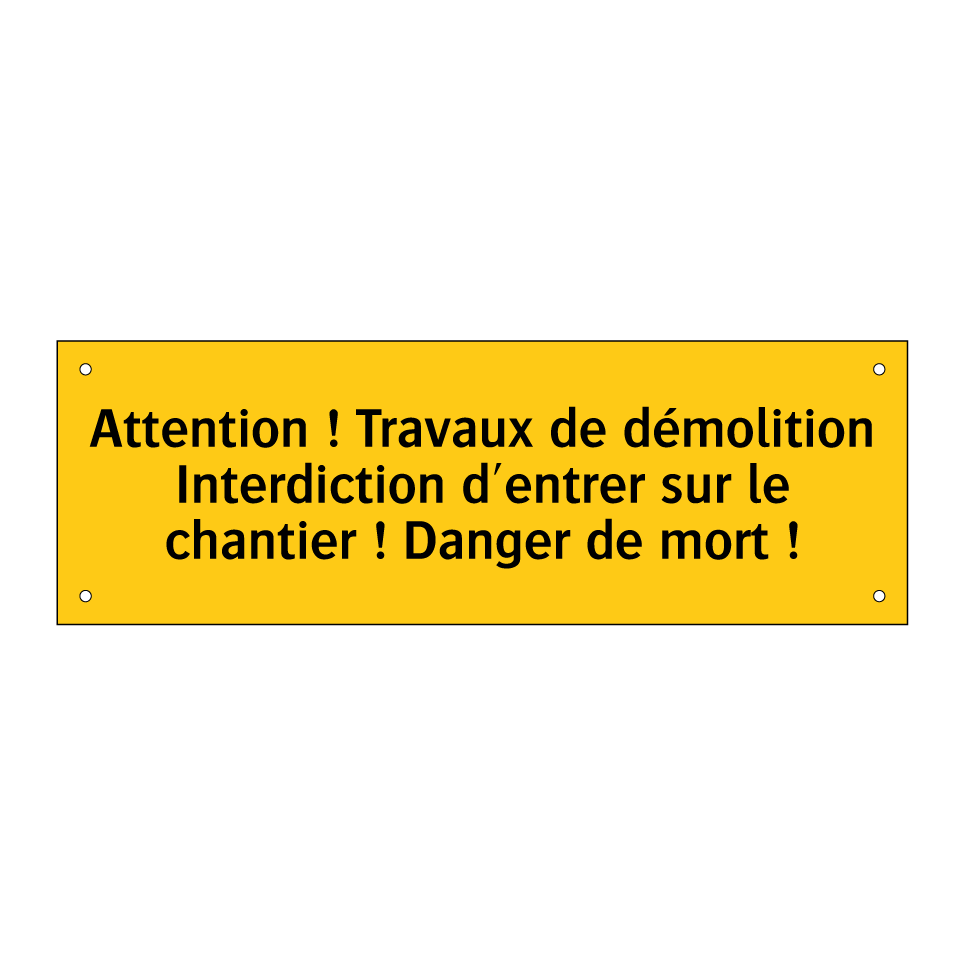 Panneau d'avertissement avec le texte : "Attention ! Travaux de démolition Interdiction d'entrer sur le chantier ! Danger de mort !"