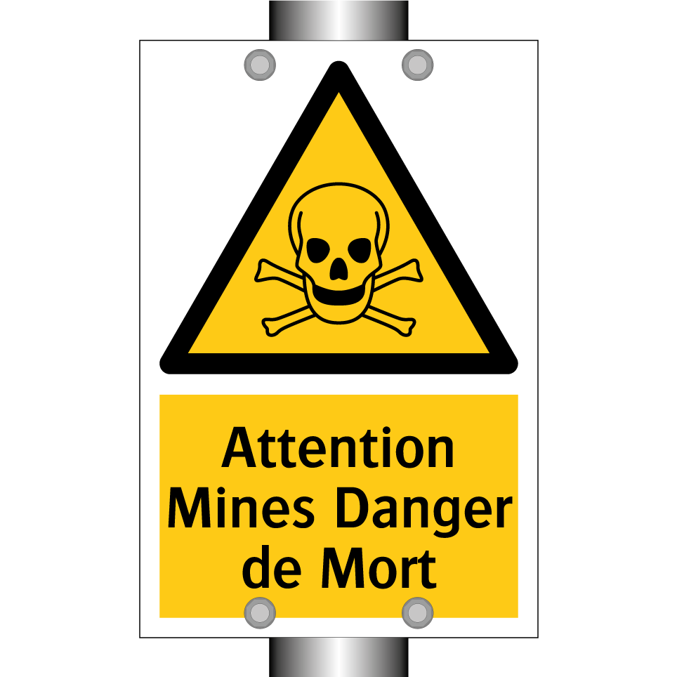 Panneau d'avertissement avec le texte : "Attention Mines Danger de Mort"