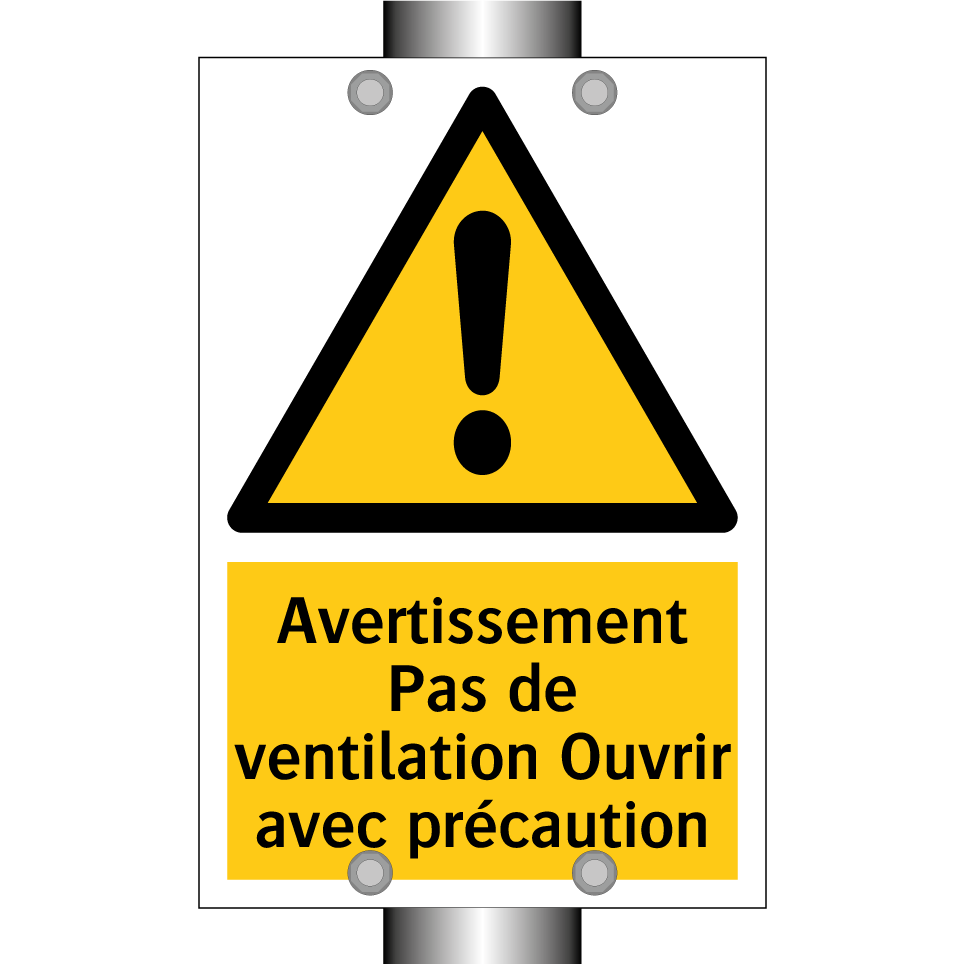 Panneau d'avertissement avec le texte : "Avertissement Pas de ventilation Ouvrir avec précaution"