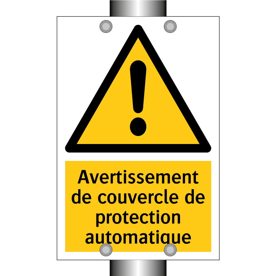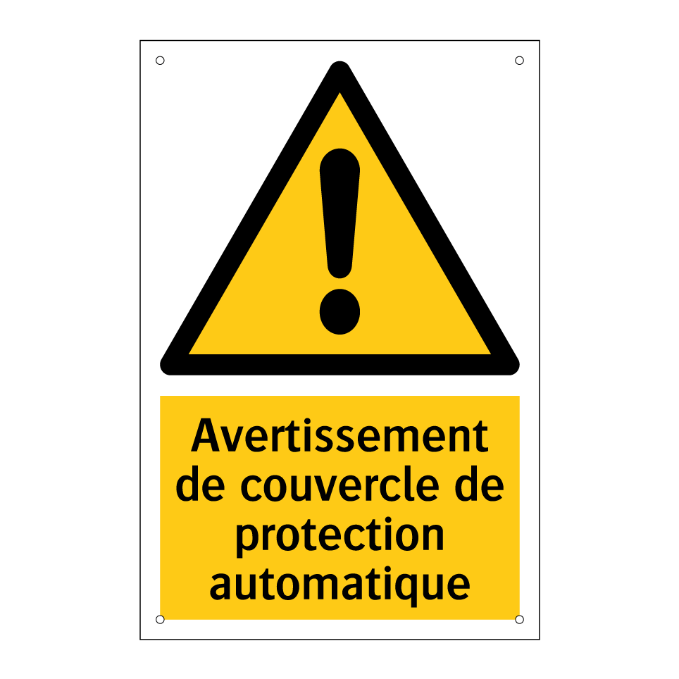 Panneau d'avertissement avec le texte : "Avertissement de couvercle de protection automatique"