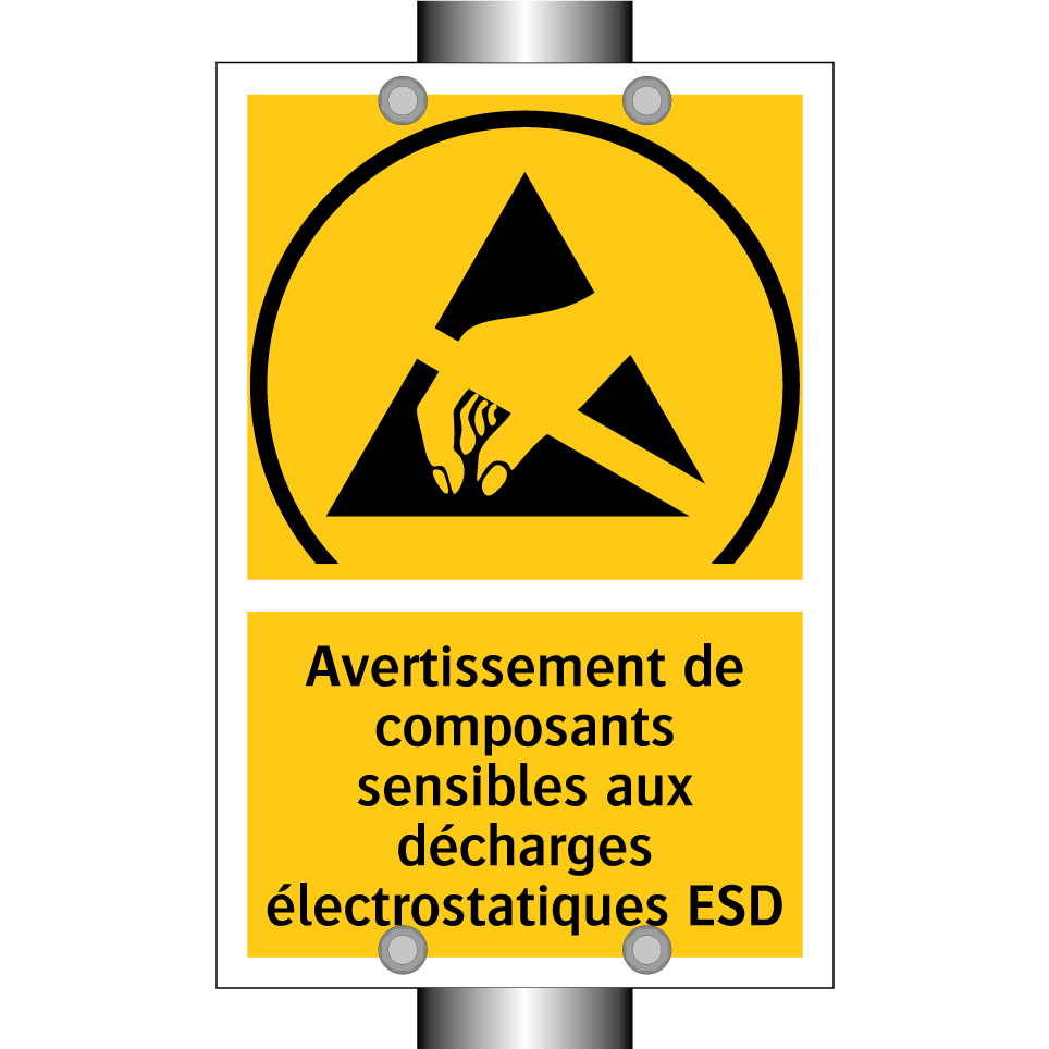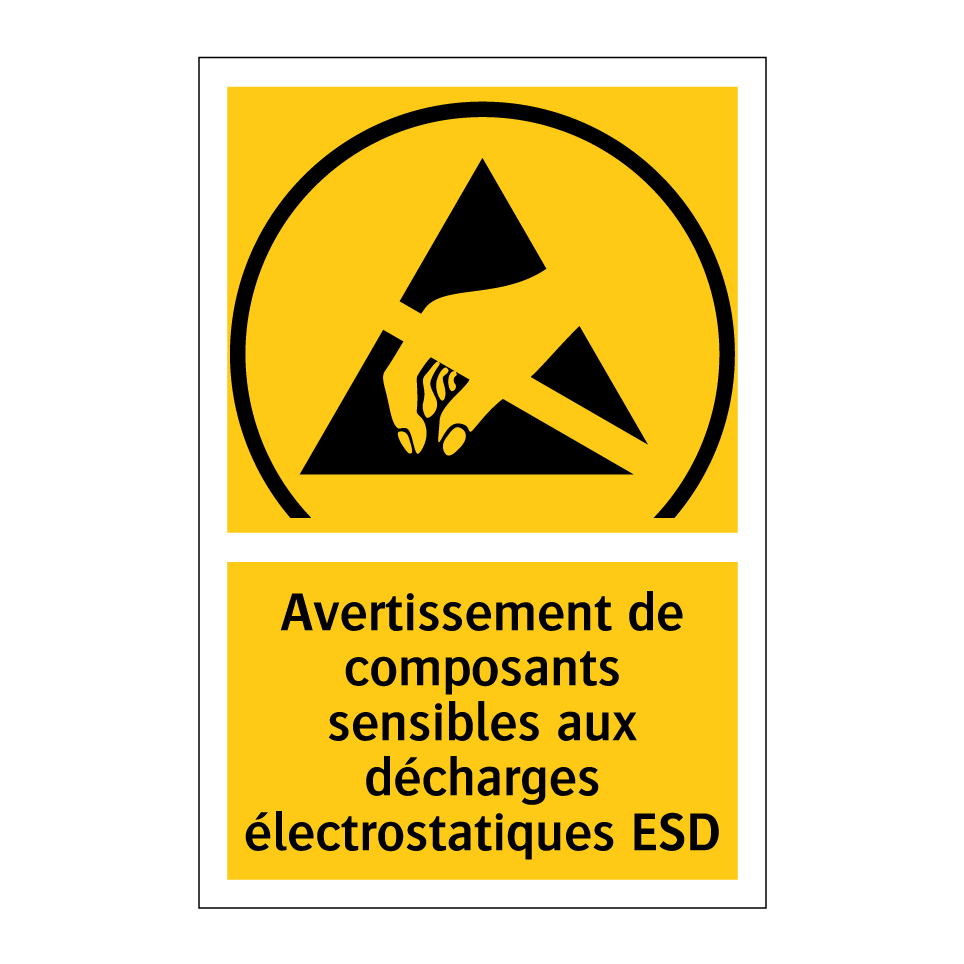 Panneau d'avertissement avec le texte : "Avertissement de composants sensibles aux décharges électrostatiques ESD"