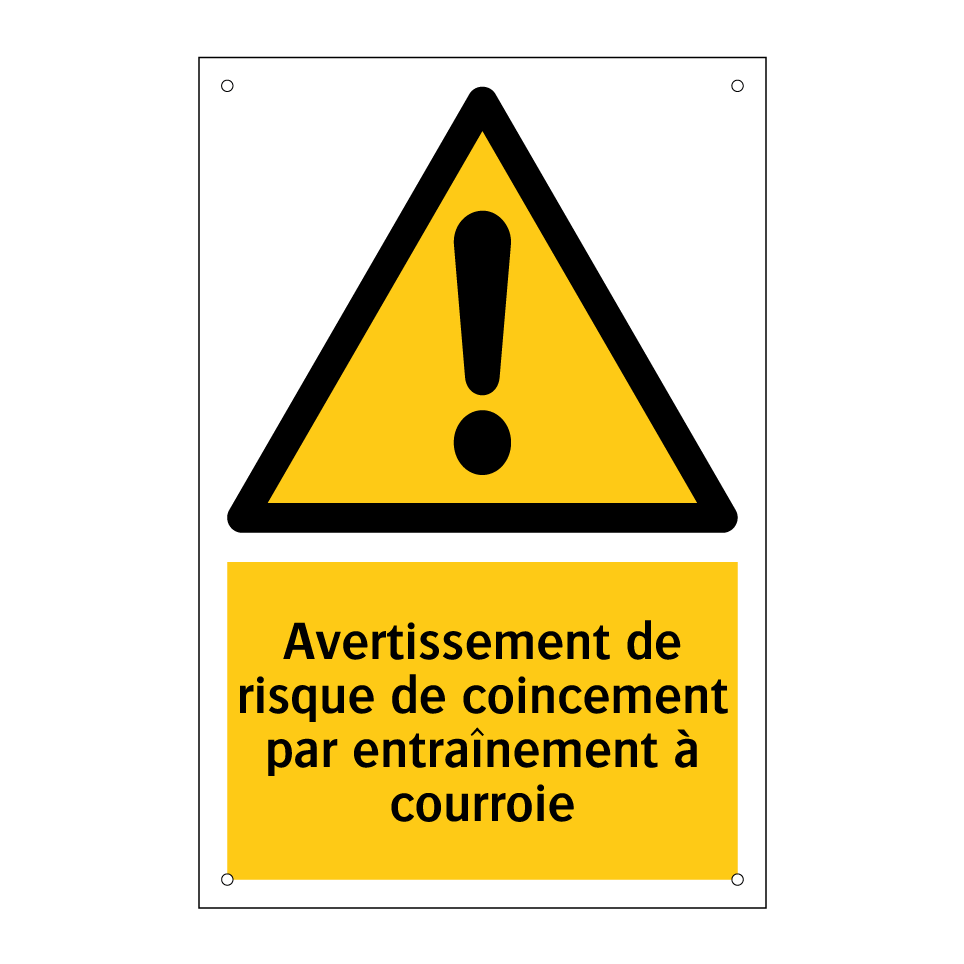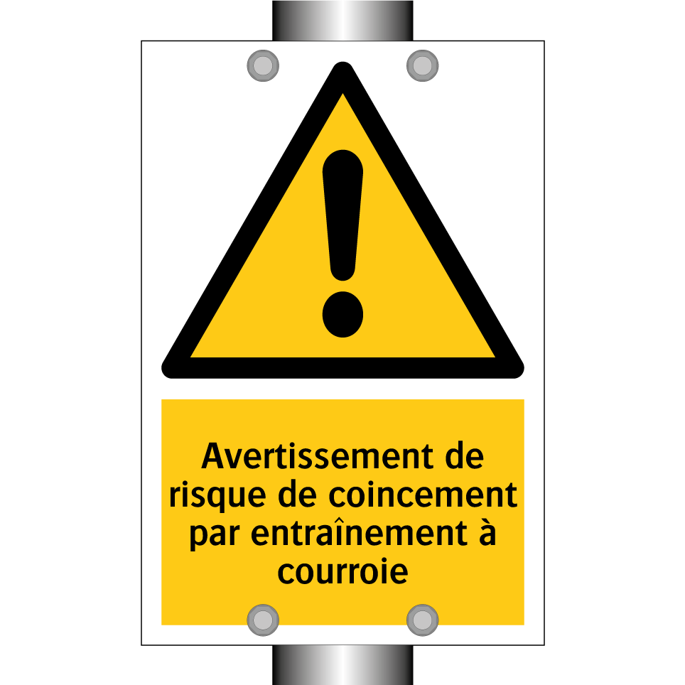 Panneau d'avertissement avec le texte : "Avertissement de risque de coincement par entraînement à courroie"