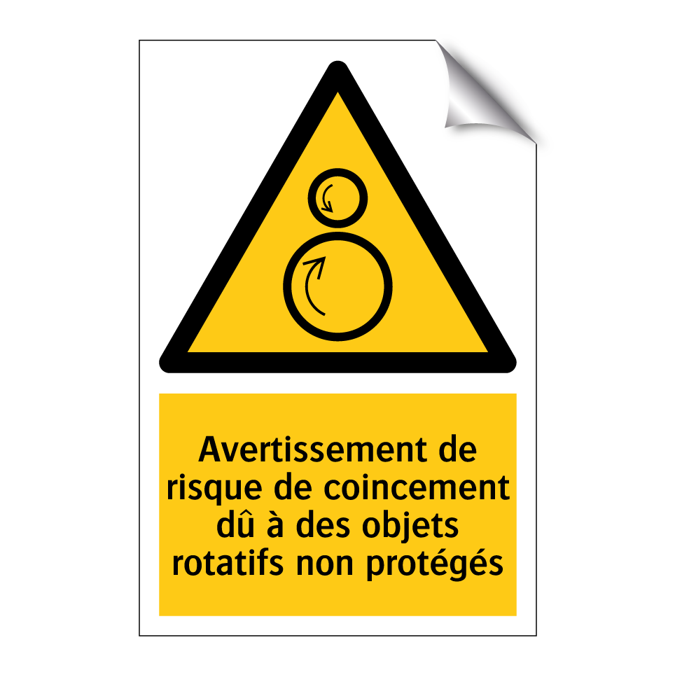 Panneau d'avertissement avec le texte : "Avertissement de risque de coincement dû à des objets rotatifs non protégés"