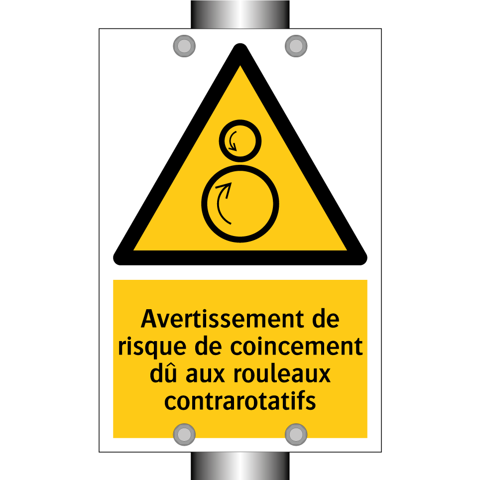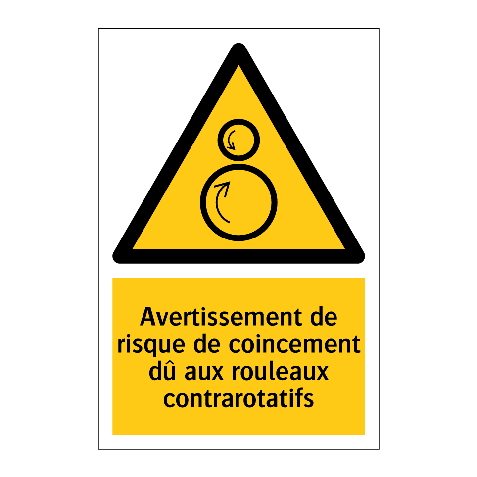 Panneau d'avertissement avec le texte : "Avertissement de risque de coincement dû aux rouleaux contrarotatifs"