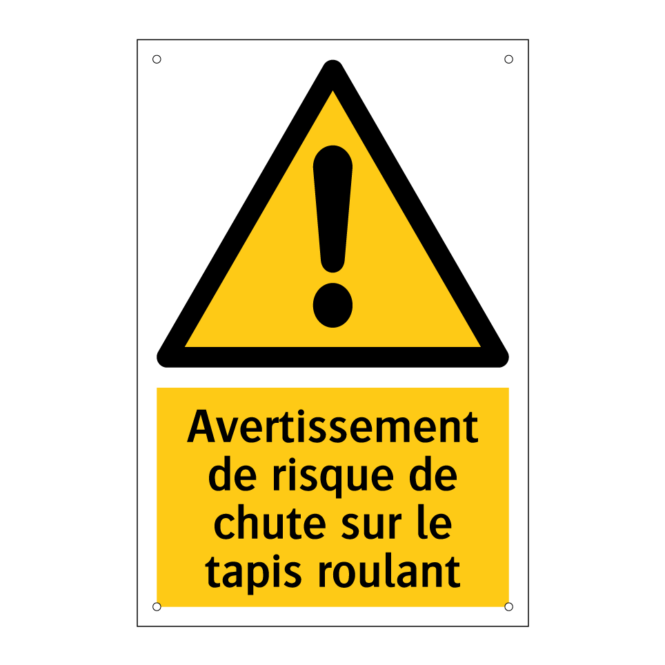 Ce panneau d'avertissement est essentiel pour garantir la sécurité dans les zones où des tapis roulants sont utilisés. Grâce à sa couleur jaune vive et son texte noir, il attire immédiatement l'attention, avertissant efficacement des risques potentiels de chute. Idéal pour les centres commerciaux, les aéroports ou les gares, ce panneau peut être placé à proximité des tapis roulants pour informer les usagers du danger. En installant ce panneau, vous contribuez à prévenir les accidents et à assurer un environnement sécurisé pour tous. Sa symbolique claire et son message direct en font un outil indispensable pour toute zone à risque.