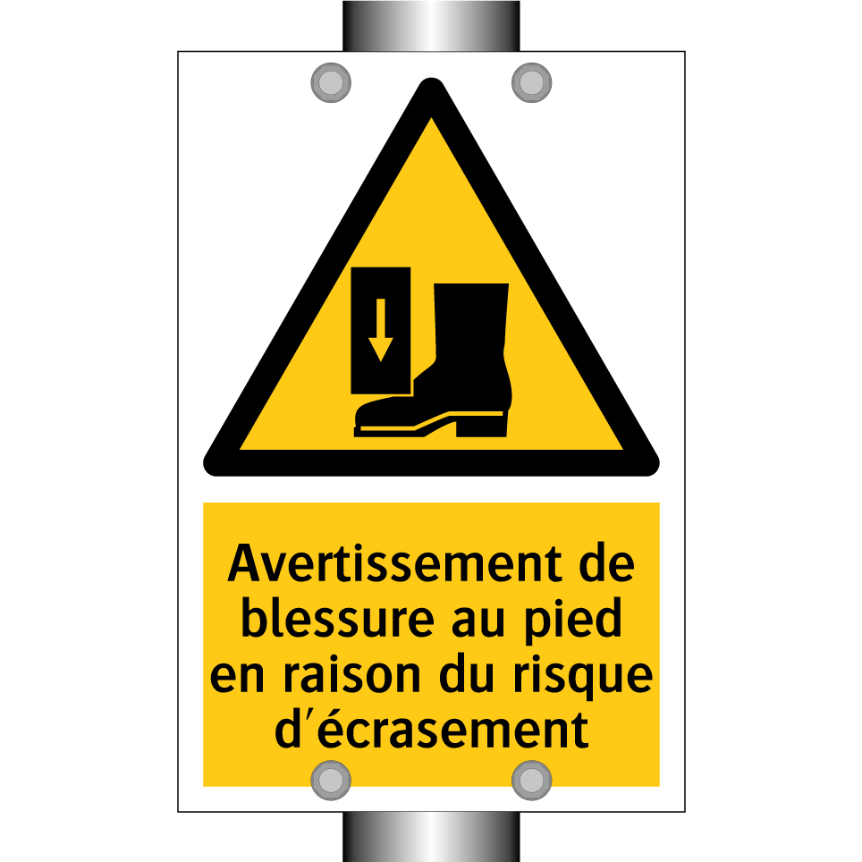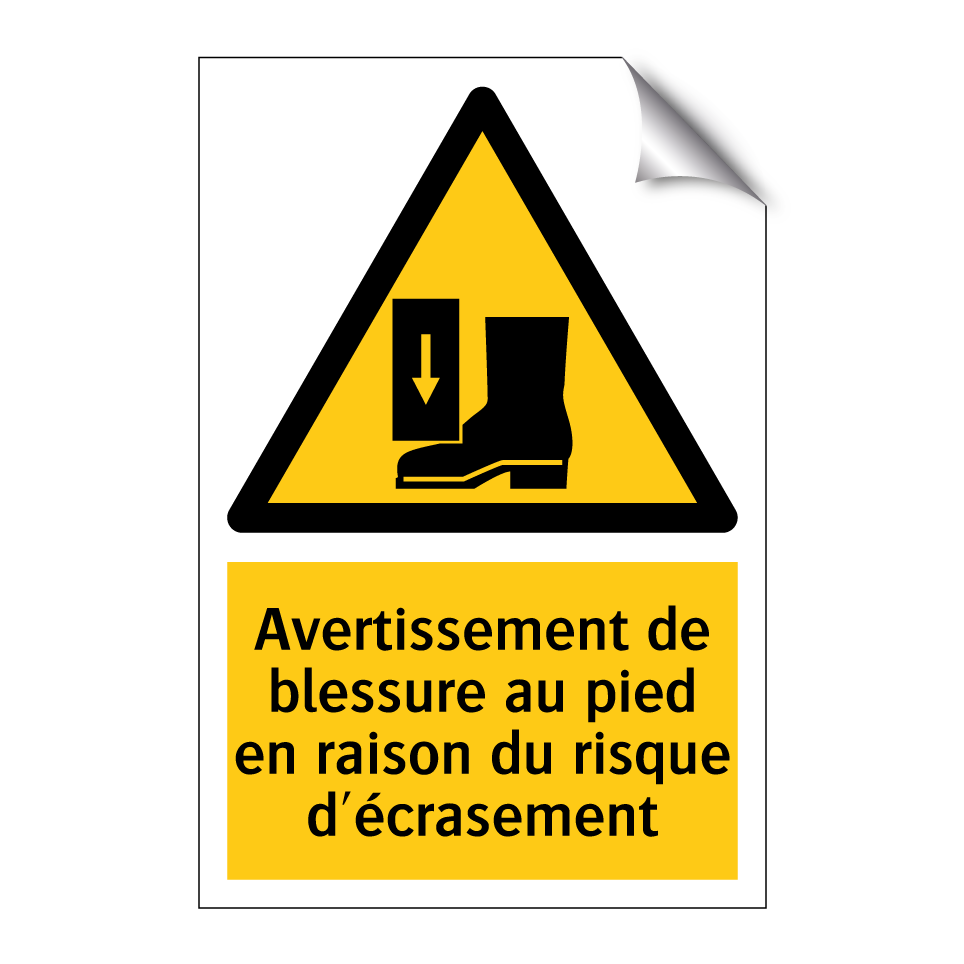 Panneau d'avertissement avec le texte : "Avertissement de blessure au pied en raison du risque d'écrasement"