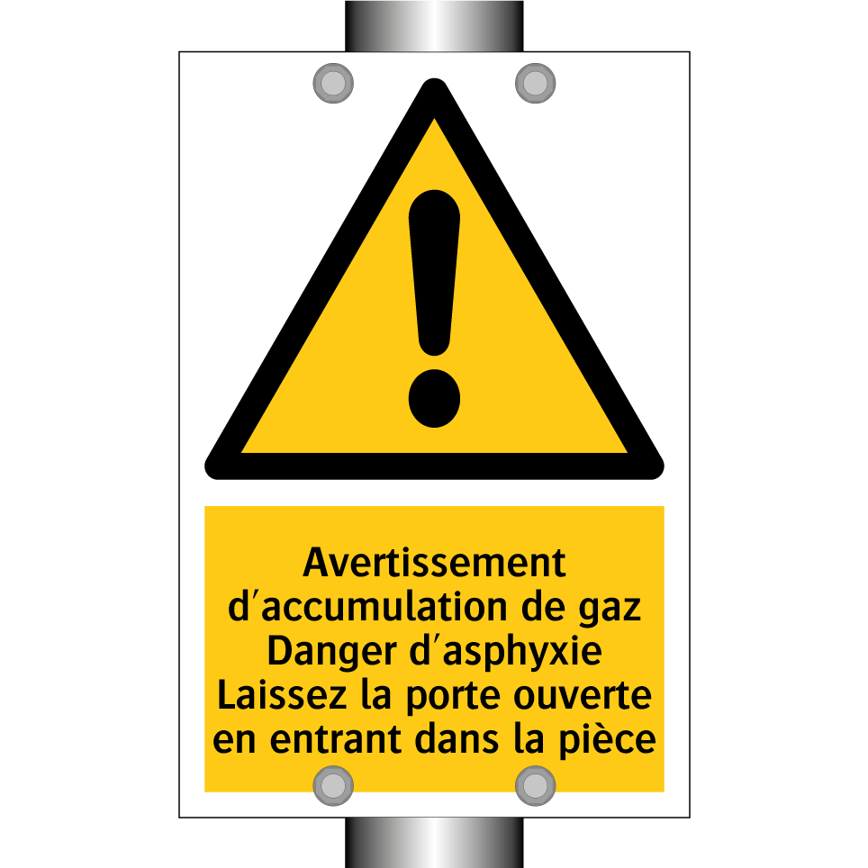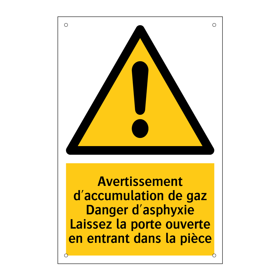 Panneau d'avertissement avec le texte : "Avertissement d'accumulation de gaz Danger d'asphyxie Laissez la porte ouverte en entrant dans la pièce"