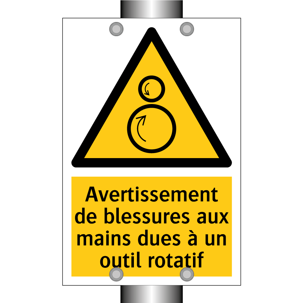 Panneau d'avertissement avec le texte : "Avertissement de blessures aux mains dues à un outil rotatif"