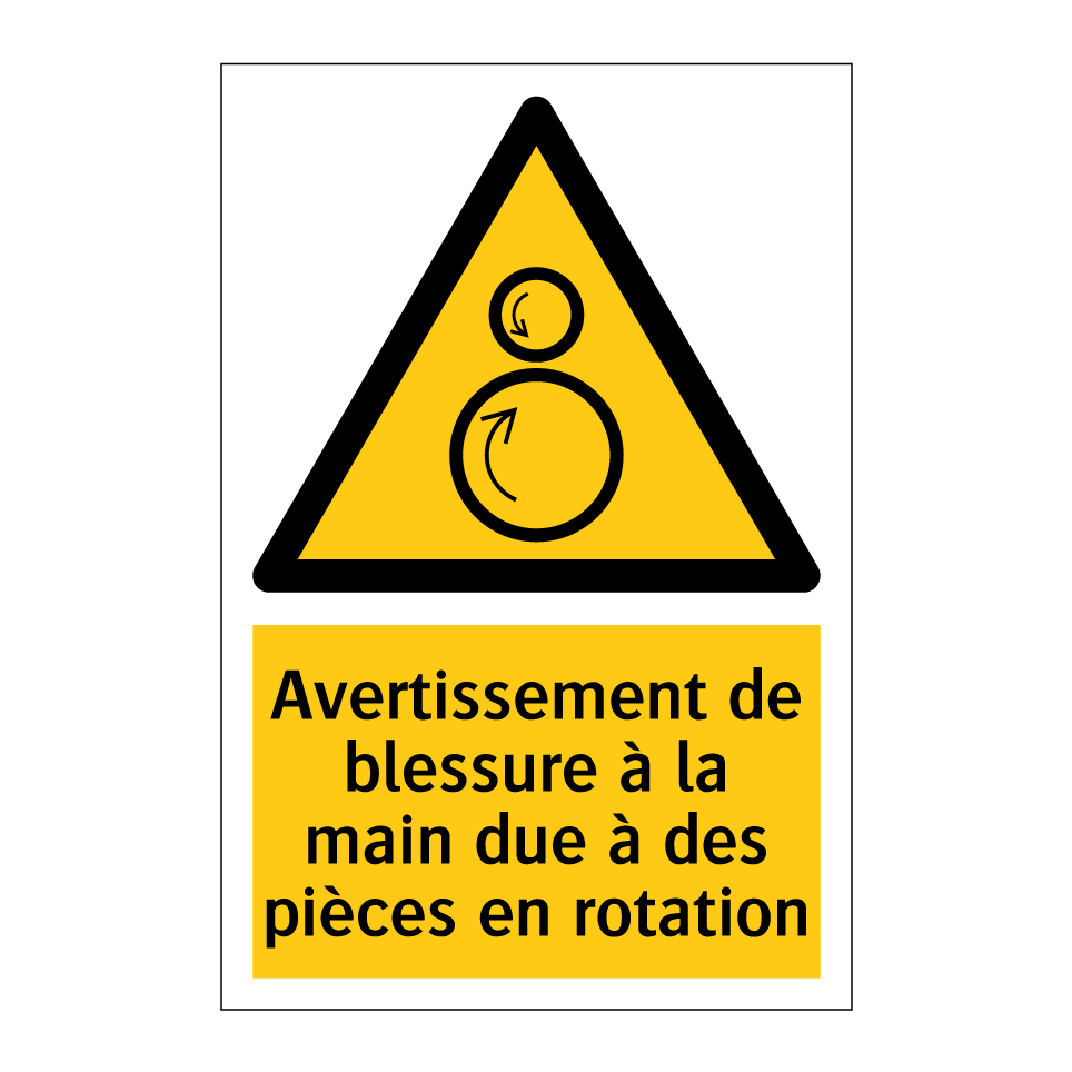 Panneau d'avertissement avec le texte : "Avertissement de blessure à la main due à des pièces en rotation"
