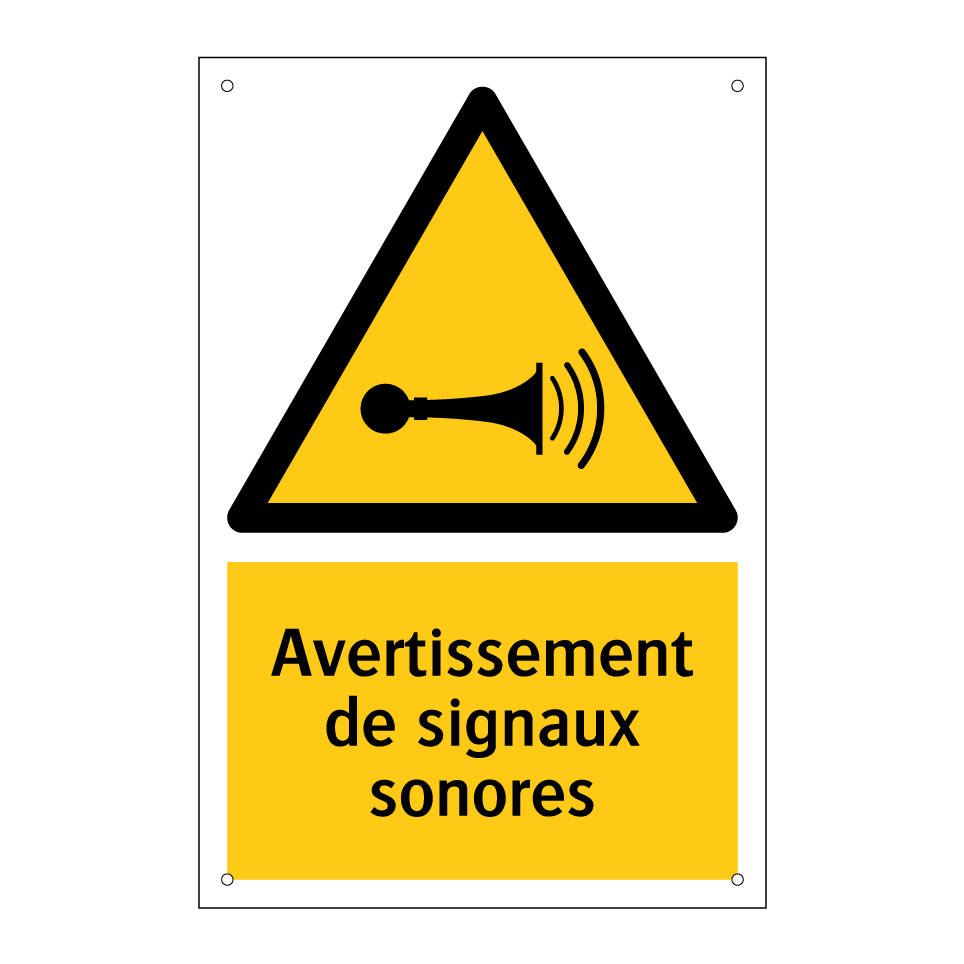 Panneau d'avertissement avec le texte : "Avertissement de signaux sonores"