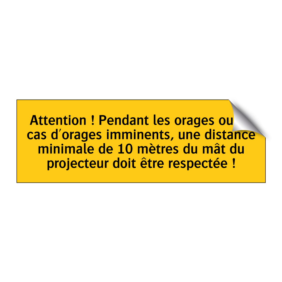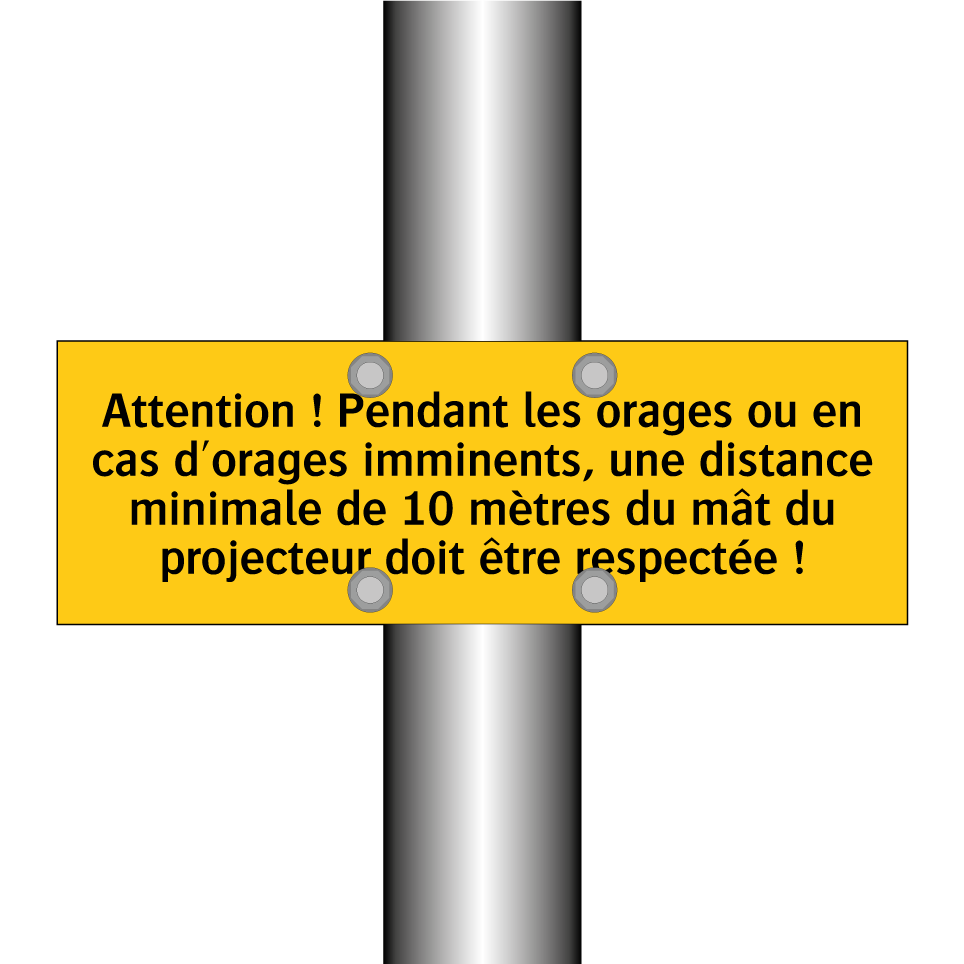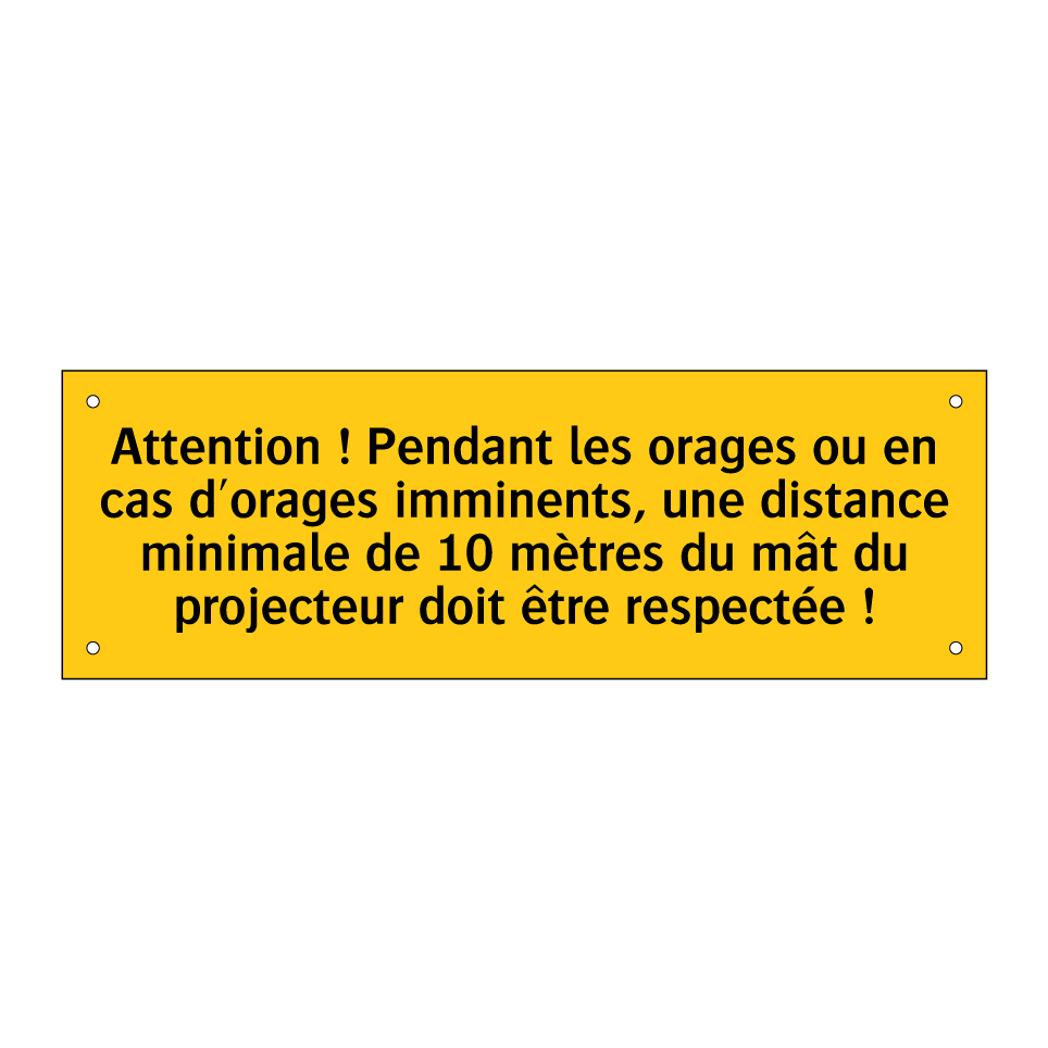 Panneau d'avertissement avec le texte : "Attention ! Pendant les orages ou en cas d'orages imminents, une distance minimale de 10 mètres du mât du projecteur doit être respectée !"