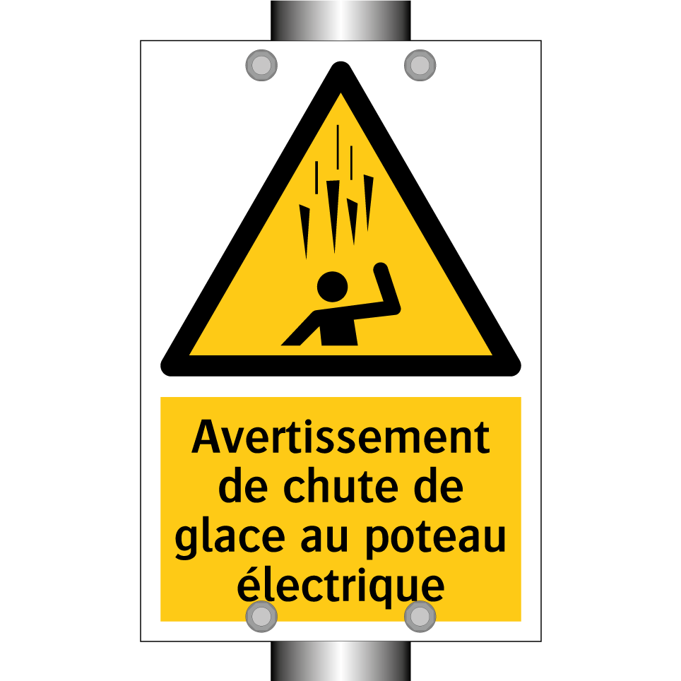 Panneau d'avertissement avec le texte : "Avertissement de chute de glace au poteau électrique"