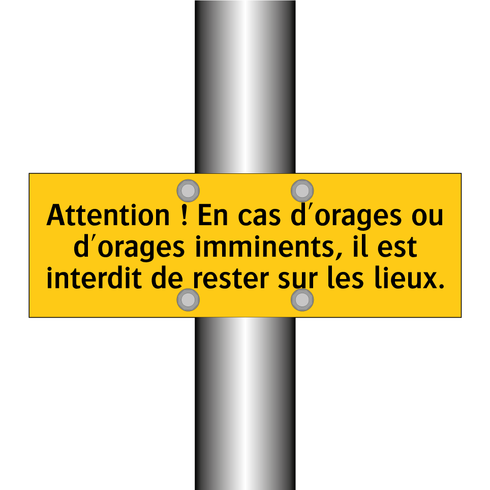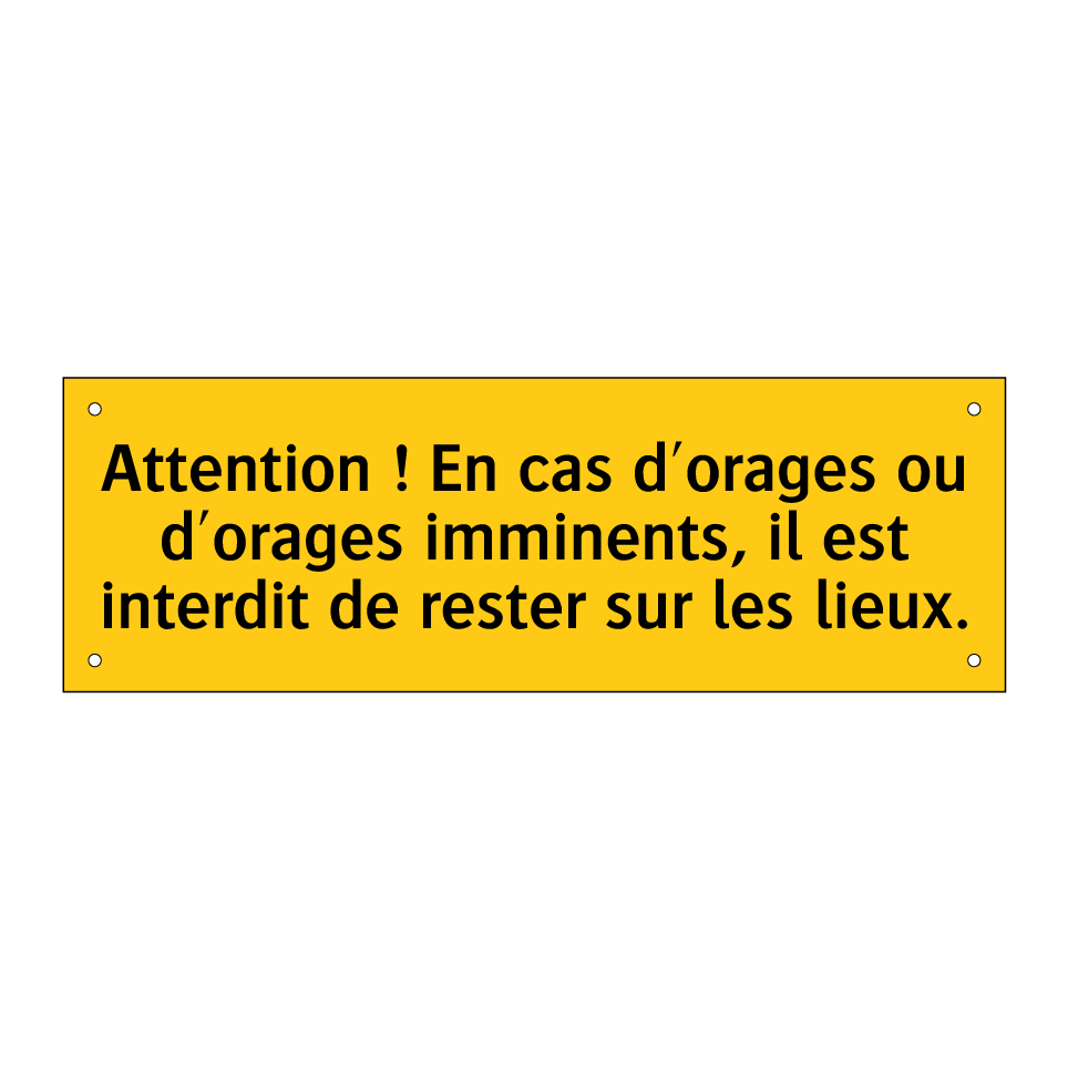 Ce panneau d'avertissement est essentiel pour garantir la sécurité dans les zones sujettes aux orages. Idéal pour les parcs, les plages ou tout espace extérieur, il informe clairement les visiteurs des dangers potentiels liés aux conditions météorologiques. En plaçant ce panneau à des endroits stratégiques, vous assurez une communication efficace des consignes de sécurité, incitant les personnes à quitter les lieux en cas de tempête. Sa couleur jaune vive et son texte noir attirent immédiatement l'attention, rendant le message impossible à ignorer. Ce panneau est un outil indispensable pour prévenir les accidents et protéger le public.